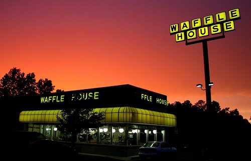 When I think of Waffle House, my first thought goes to the family trip to Florida and Disney World many, many years ago. Those that know me well know I went to Disney half a dozen times over my lifetime but only once did we travel by car. 1988 Ford Aerostar to be exact. Anyway, along the way we stopped at what seemed like every Waffle House on the interstate. Many good memories from that trip. Also, it seems most of the important conversations I had with my wife before we got married took place at Waffle House (the one on 11th, before it was bulldozed and turned around…see the picture on the right). I can close my eyes and see scores of meals with friends and family, sometimes drunk, sometimes when the sun was rising, sometimes for hours.