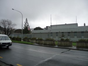 The U.S. Embassy in Wellington is a small collection of dour, concrete buildings surrounded by tall fences. I also saw what I believed to be tank stops, though who in NZ owns a tank is beyond me. Anyway, we walked up to the door and found it locked. Two guards nearby waved their arms frantically for us to come over there. So we did. Two kiwi’s were behind this impressively shielded guard station with an intercom and a small area where something no bigger than a piece of paper could slide through.