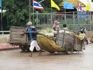 At first I was reminded of Indonesia, but it soon became evident that Cambodia was a lot poorer than Indonesia. Indi compared it to entering the Wild West, and that’s not far off. There are paved roads in the towns, but even they are dirt covered and in generally poor shape. There were carts being pulled by large pack animals and some even by people. We had arranged for a taxi ride to Siem Reap (a little over an hour into Cambodia from the border) and settled in for the last leg of the day trip.