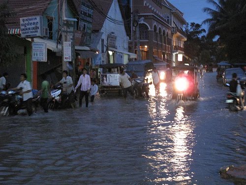 As we got closer to Siem Reap, the water started looking like more than typical monsoon puddles. Some areas were downright flooded. When we reached the city limits, it was obvious that this wasn’t normal. Hotels were flooded. Roads were impassable. Typhoon Ketsana had drifted a little further south than predicted, and although there hasn’t been any wind damage, the river breached it’s banks. We reached our hotel (via more dirt roads) and it’s in fine shape, but a 5 minute walk to the main area of town serves boats better than cars.