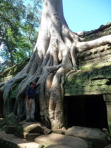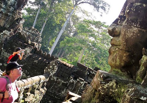 Our next destination took us beyond the walls of Angkor Thom to the over-crowded temple of Ta Prohm. A 12th century temple that is known for having huge trees growing throughout the complex, it gets it’s suffocating throngs of tourists from being features in several movies, most recently Tomb Raider. It wasn’t as impressive as we’d hoped, and were endlessly frustrated with the amount of people crammed into it’s maze of corridors and ledges. The recent typhoon rains had also left a few paths submerged and wet feet tend to make me cranky. We took some pictures and retreated back to our tuk-tuk in less than an hour.