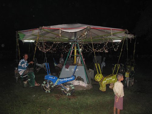 Centered around a Buddhist temple in a rural Cambodian field, the festival was a mixture of cultural celebration and old-fashioned carnival. On one side, you had a group of monks and praying villagers, and on the other you had a midway of darts, balloons, and busy food stalls. There were a few mechanical rides up front, as well as a screen with movies playing and a live play stage near the back.