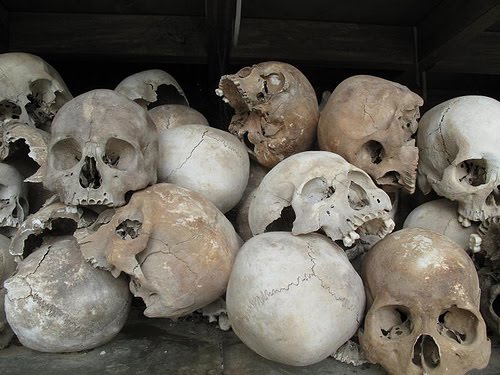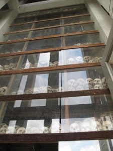 The skulls that have been exhumed are interred in a large, concrete stupa – a Buddhist holy building. There are seventeen levels of hundreds of skulls – it reaches beyond seeing into the shadows of the roof. At the upper reaches of sight, only the alternating white of sun-bleached bone and black, sad-looking orbital sockets can be seen.
