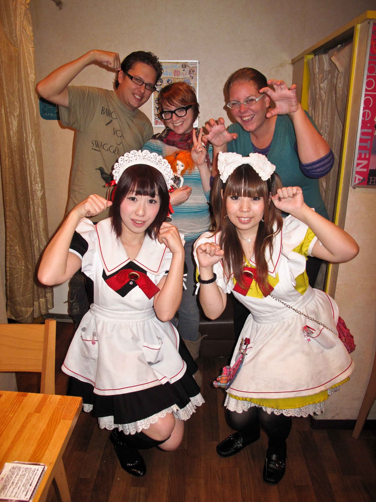 We crashed hard afterwards (Nikki had spent the last twenty-five hours flying to Japan, remember) but the caffeine-fueled evening helped us all get on the same schedule today. The weather was cold again today (but no rain!) and we headed BACK to the Shinsaibashi area to do some shopping. We slowly meandered down to Den Den Town so we could achieve one of Nikki’s visitation goals: maid cafe. We had scouted a good one out some weeks ago and we beelined for it. We sat for about an hour and a half in the cute little cafe as we enjoyed some hot beverages in the company of some impossibly cute Japanese girls in maid outfits. They evidently don’t get many Westerners as we got some free pictures with them (at their insistence) and the one dressed as a devil maid often came up to practice her English and inquire as to our reasons for coming to Osaka. It was good times.
