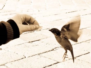 Me feeding a brave little sparrow, before the seagulls noticed I had food.