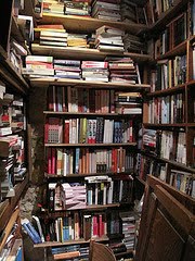 And we found it. I walked in and was hit by history – and a falling book. Books are everywhere. Literally everywhere. As we entered, the front half of the bottom floor was plunged into darkness as a fuse blew, and people continued on as if nothing had happened. The tumbleweeds moved surely to fix the problem, but no one was in a great rush – and none of the customers were grumbling. Making my way carefully and slowly (can’t move fast in that place – too many precarious stacks in every nook and cranny!) to the narrow staircase, I ascended to the second floor where the private collections are kept. I say private, but nothing is really private there. The books are not for sale, but anyone may find a place to sit and read them. Anyone. There are little corners here and there with a bench and pillows, or a mattress behind a blind corner, for the writers to stay. The motto of the store is “Be kind to strangers, lest they be angels in disguise.” It wasn’t kitsch, it wasn’t “sold out,” it wasn’t strange or formal. It was comfortable, like a good old book should be, and similarly, challenging. It’s very existence asks the question – why shouldn’t it be like this? Why not personable, with full backlists of novelists and authors, with “staff” who really love what they do and know probably more about what you’re looking for than you do? Why go the route of big-box bookshops that are brightly lit and modern, but clinical and sterile at the same time? I love my Barnes & Noble, sure, but seeing Shakespeare & Company made me wonder if it is pure anachronism now. Is this experience a lost one?