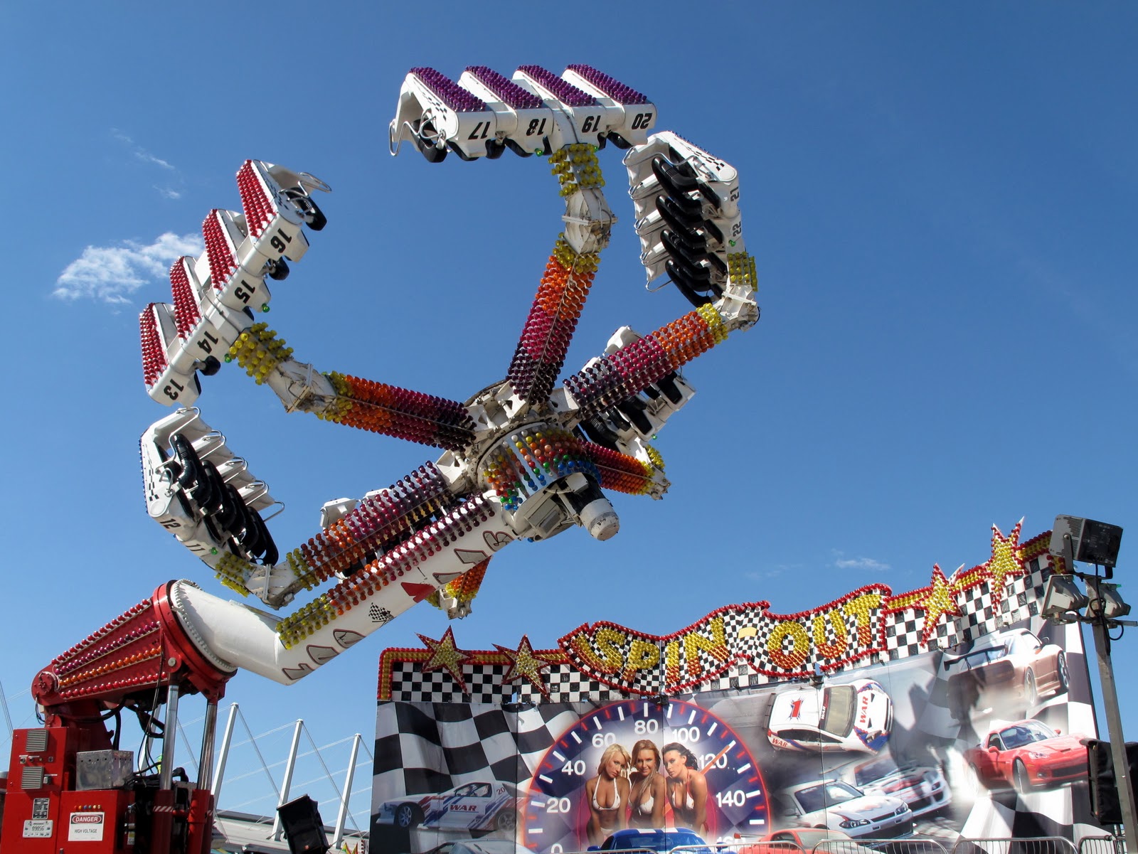 I got to the front and stared up at the massive structure, adorned with a 97.5 KMOD radio station ‘T-Shirt’ made of what looked to be parachute material. Once I was satisfied with my gawking, I went inside the main exhibition hall. The inside of the Quiktrip Center can be summed up as such: RVs, Hot Tubs, ATVs, New Cars, Salesmen, Vendors (there is a difference), political propaganda, and Food. Walking the aisles filled me with nostalgia, because although everything is new, everything is also old. Tulsa Police Dept. is always there showing off riot gear and firearms. The back wall is lined with furniture. The lower part of the building is teeming with people eager to show off their products. This year there was even a cake contest! I wandered through, looking and listening, but quickly tired of it. I set my sights on what I really wanted to come see: the rides and the midway.