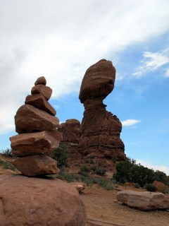 I had marked the park down as a ‘must visit’ back in April of 2012. That road trip never happened, but fifteen months later I was finally on my way. The drive covered some of the same ground I drove from Grand Junction to Salt Lake City, but seeing it coming the other way was a new experience. I saw things I missed the first time around and found places to stop and take pictures. After a quick 4 hour drive (seriously, it just breezed by) we arrived. We immediately stopped to get a picture of the entrance sign and met a family from Minnesota. “Have you been in before?” the father asked. When I said no, he grinned. “Oh, man. You’re going to LOVE it!” I was already excited but random traveler excitement just added to my anticipation. Once we actually entered the park, every license plate I saw was from a different state. I heard as many different languages as I did in Washington, D.C. It was amazing to share the sights with people from all over the world.I also became less tolerant of the occasional sprinkles I’d driven through on the way down. Surely it would clear up soon. We stopped at a few early places and marveled at the unfathomably large rock structures and I used my hat to shield my camera from the maddening precipitation. Thankfully, after about twenty minutes, the clouds parted and I was greeted with blue sky. The amazing landscape that I could scarcely believe was amplified by the change; the orange and red colors of the rock formations blazed in the sunlight. When we arrived at Balanced Rock, the rain clouds were almost totally gone.