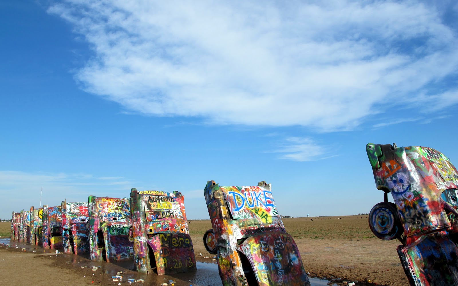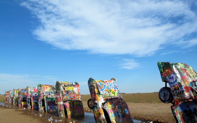 As we approached Amarillo, we stopped at our last detour of the day: Cadillac Ranch. An art installation dating back to 1974, it consists of multiple various-model classic Cadillac cars buried past the hoods and sticking out of the ground at an angle. People are encouraged to come by and add their own art to the living canvas by spray-painting on the junked vehicles. It’s really something, especially considering the cars are on an actual in-use ranch. Cows grazed nearby as I sprayed my initials on a tire rim and took pictures of the rest of the cars. It’s definitely a surreal sight.