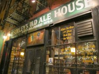 By the time we arrived at our actual final stop of the day, it was full-on night. The slushy streets were turning more treacherous and the unfamiliar streets felt a little more menacing in the East Village. After all, I was the one leading this party today. While I was sure my companions would tell me if I was wandering into a questionable part of town, I still kept my head on a swivel. As with the rest of my time here, I had no problems and arrived at my destination unimpeded. McSorley’s Old Ale House is the oldest Irish pub in the city, being in constant service since the 1850s. Back when New York City was his home, Woody Guthrie spent a lot of time singing and drinking there. They only serve two kinds of beer: dark and light versions of their house ale. I ordered a dark beer (served in a pair of smaller mugs) and drank in the ale along with my surroundings. An ancient refrigerator, beer taps that had to be at least 50 years old, and countless pictures and articles on the walls. Behind me, I felt heat from the old stove that I recognized from a TIME Life photo of Woody Guthrie and his guitar. Sam took my picture next to it, too, and I left the pub a happy man.