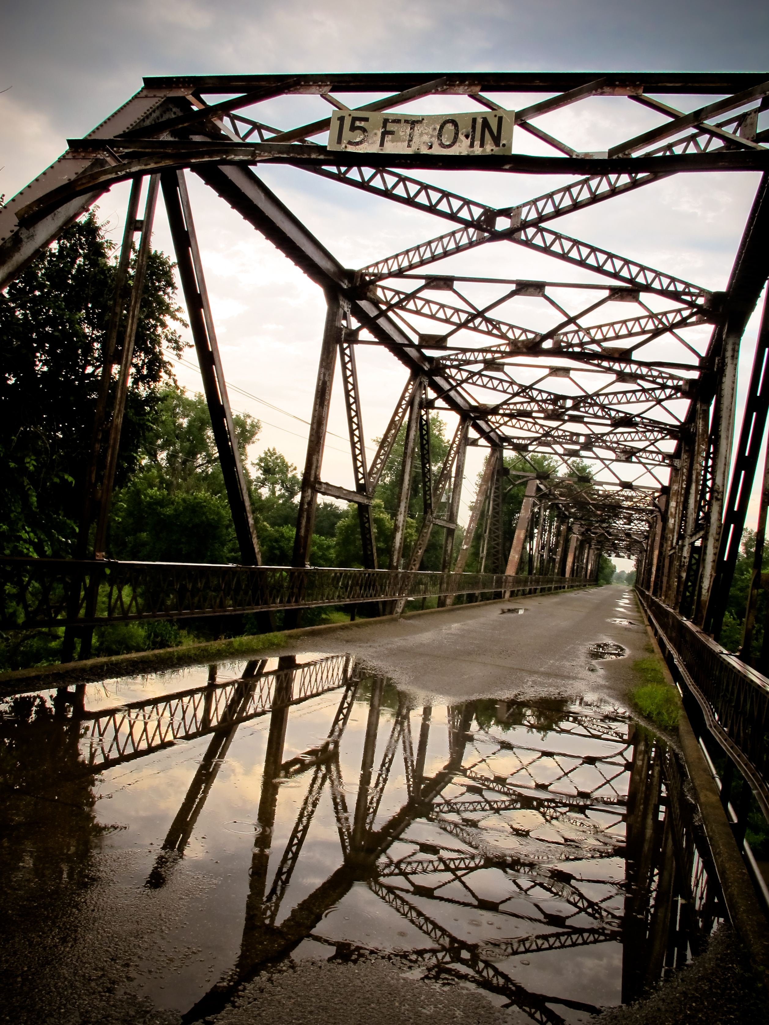 More abandoned sights greeted me as we drove on. Storm clouds gathered overhead and threatened to end my photographic journey prematurely, but we dodged the rain bullet for most of the day. I found a beautifully withered gas station in Foss, stopped at Lucille’s restored service station in Hydro, and stopped north of Hinton to get some shots of a 4,000 foot long pony truss bridge. Lunch brought us to Okarche where we dined on some of the finest fried chicken I’ve ever had at Eischen’s, the oldest bar in the state.
