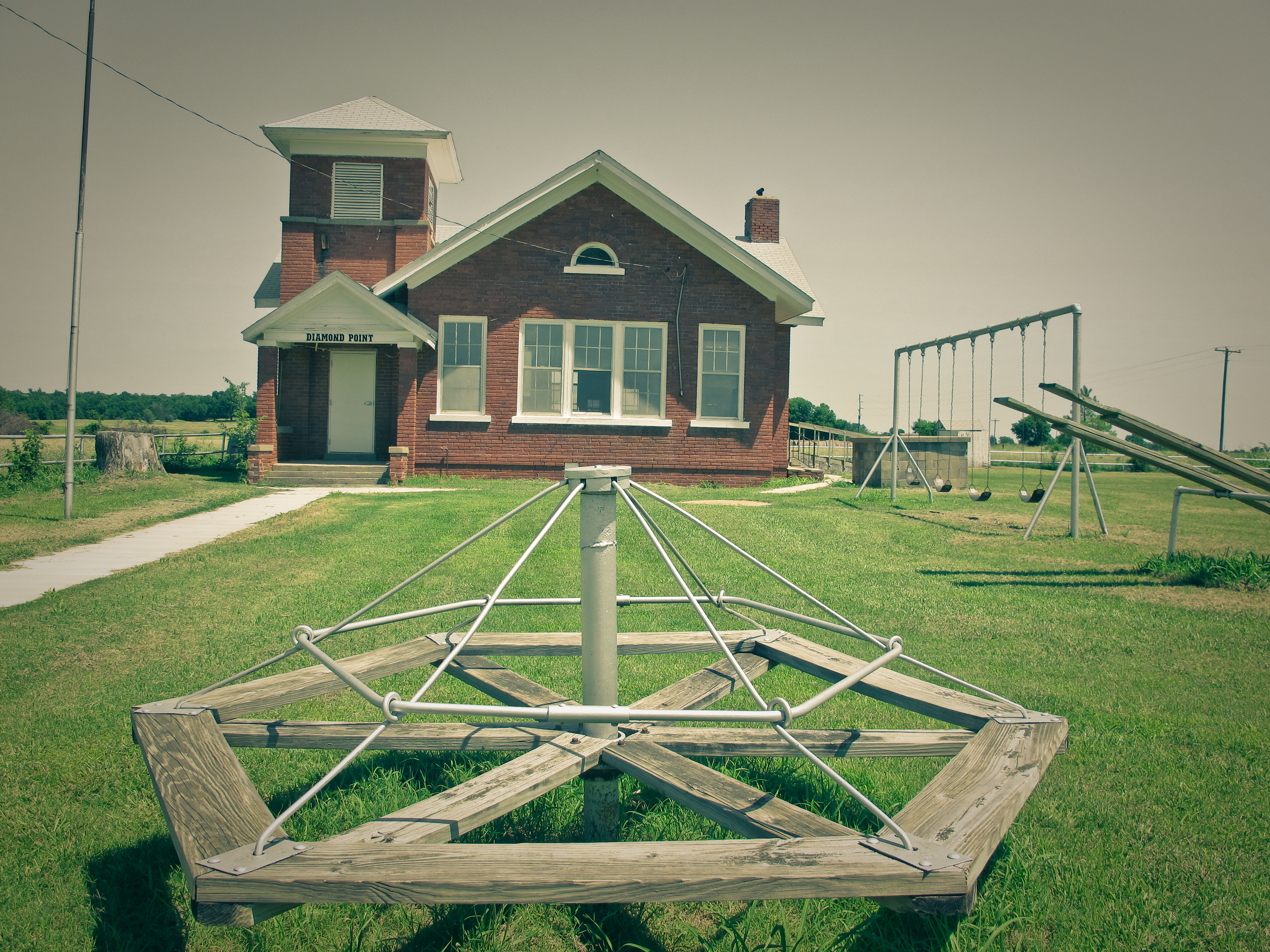 Once my camera was satisfied, I thought it might be nice to revisit Nowata. I hadn’t been in many years and my love of small towns has grown exponentially since then. On the way, I took a gravel road off the highway to see if I could find another relic, and I was successful. The Diamond Point Schoolhouse was built in 1919 and currently sits at a gravel crossroads, surrounded by prairie farmland. It’s not hard to picture it back when it was built, especially since it was restored in 1996. There’s an old slide, merry-go-round, teeter-totters, and a set of swings. The old boys and girls rooms sit on the edge of the property, home to more wasps than I cared to count. Inside the schoolhouse are old desks, and I discovered that the city of Nowata still uses it to show modern schoolkids what the classroom was like back in the day.