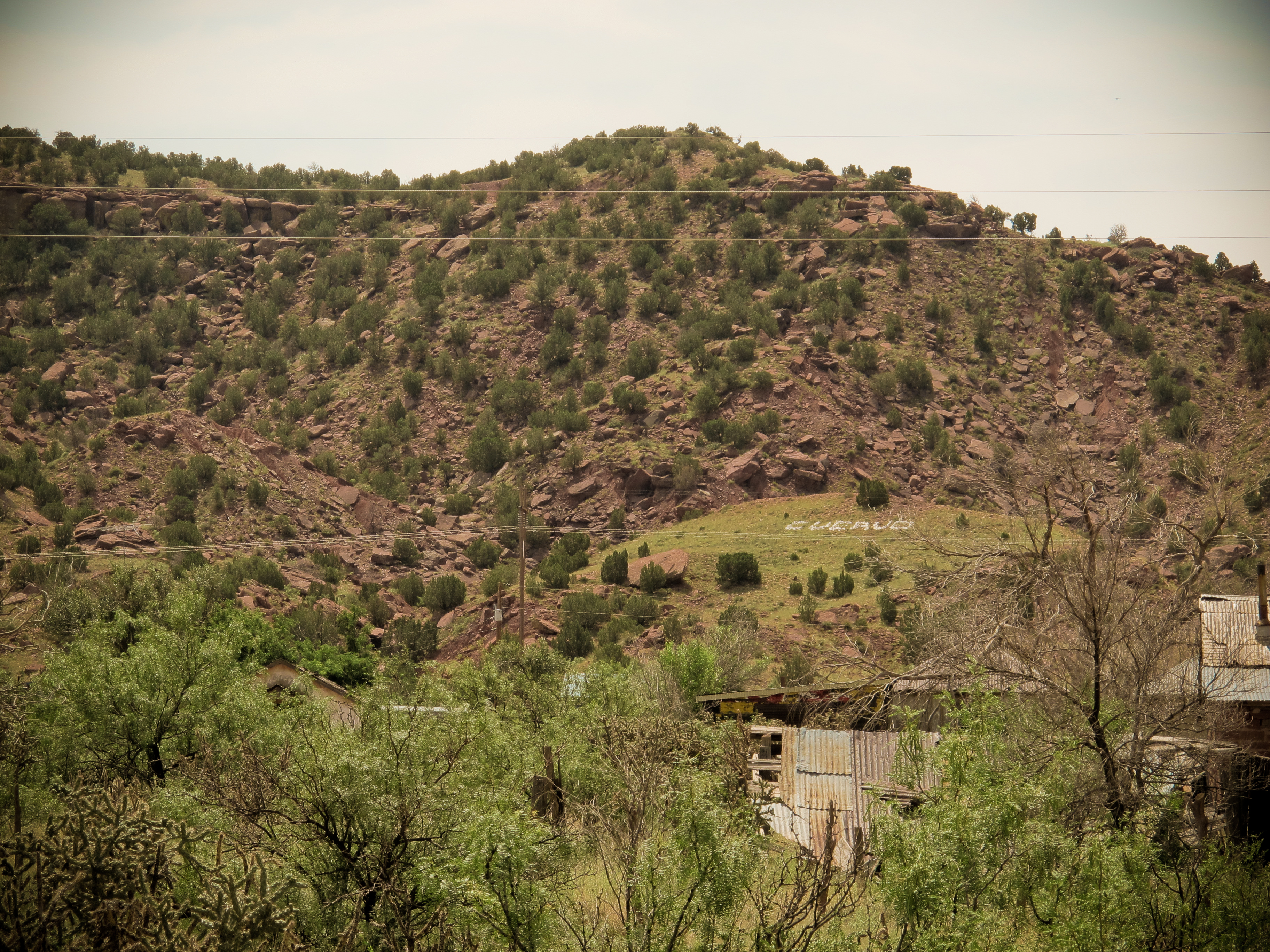 14 Cuervo-3The next place I pulled off was the small town of Cuervo, New Mexico…supposedly home to the smallest post office in the country.  Well, it’s definitely small…because I couldn’t find it!  The town had all the hallmarks of a Route 66 ghost town:  vacant homes, roads in disrepair, skeletal service stations, and not a soul in sight.  A train roared past, oblivious to the elaborate cemetery that was once a town.  They even had the town’s name spelled out on a nearby hillside, reminding me of my trip through Colorado and Utah last year.  From there, we drove through Newkirk and Montoya on Old 66.  I eagerly pulled over at several dilapidated buildings and roadside cafes, taking the old two-lane blacktop whenever possible.  In one area that underpassed I-40, there was even a faded Route 66 badge on the concrete.  Although I know other Route 66 enthusiasts probably drive through here somewhat regularly, it felt like nobody had driven these stretches of road in decades.  We found ourselves back in Tucumcari in no time, where we stopped briefly to greet the owner of Tepee Curios.  He had reached out to me on a Route 66 Facebook group I’m in and encouraged us to stop and say hi.