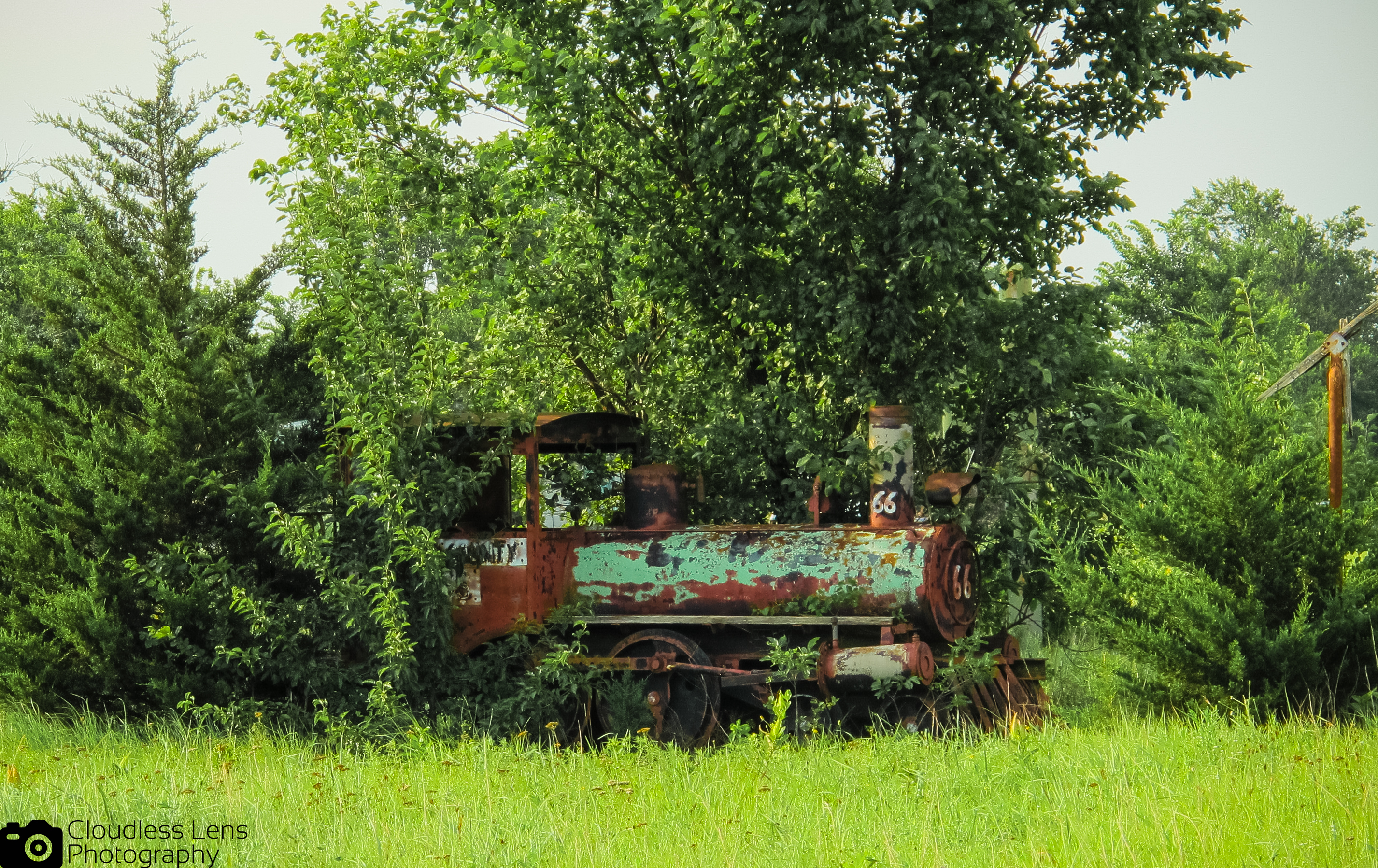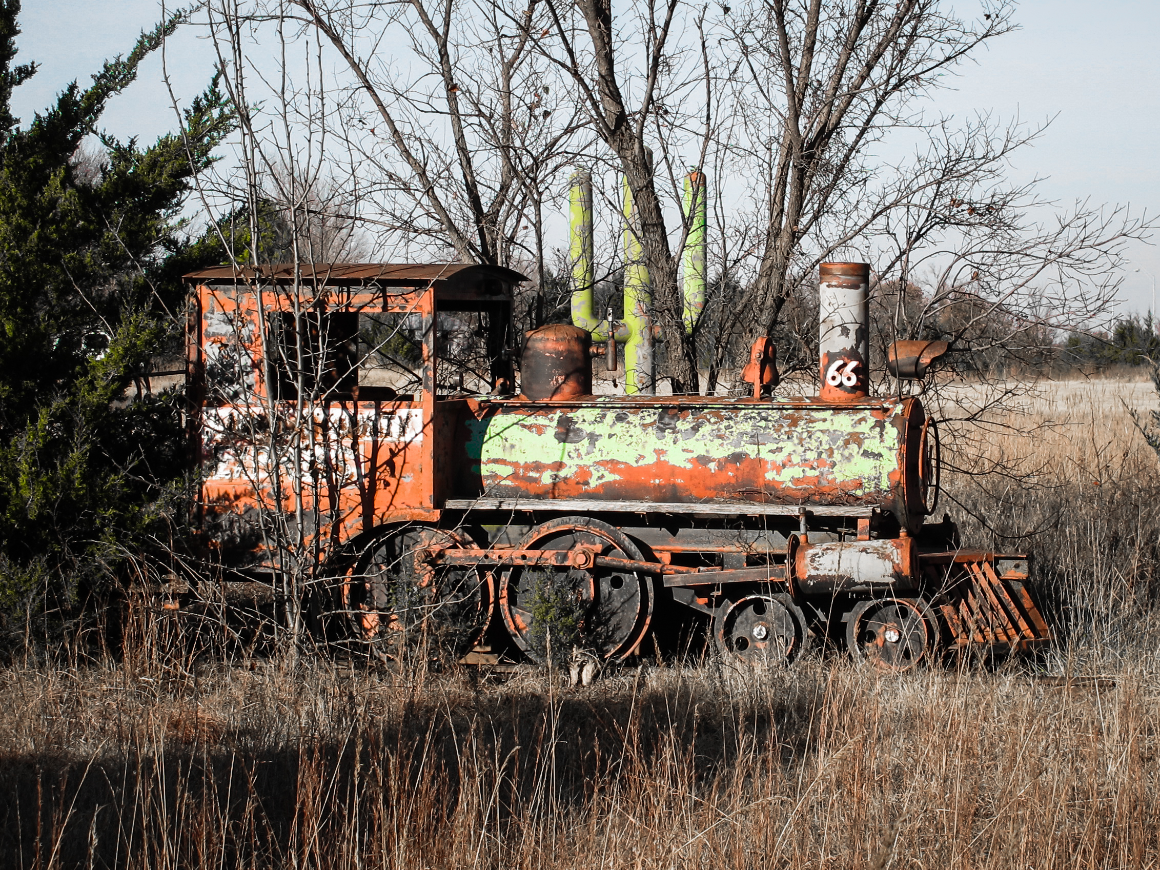 I hopped out of the car and dashed over to the little train, breathless with excitement. It was originally painted green, though there’s a significant patina now. It sat on a little facsimile bit of railroad track and was surrounded by tall grass and trees. I must have spent half an hour snapping photos and admiring the collection. I thought for sure someone was going to appear from the bushes at any moment and tell me to scram, perhaps trying to confiscate my camera in the process. It felt like I’d stumbled across a secret that was closely guarded and fiercely protected…but there were no fences, or signs telling me I was trespassing. The surrounding countryside was quiet aside from the occasional car that sped by, no doubt wondering what the heck I was doing. This was in June of last year, and the foliage nearby threatened to overtake the area. I’ve stopped a few more times over the last few months to observe it in the winter. For me, the little train represented the whole of Route 66 and the state of the historic highway. It was a reminder of a bygone era, when a trip was as much about the journey as the destination. If one takes the time to truly look around, you will find something amazing.