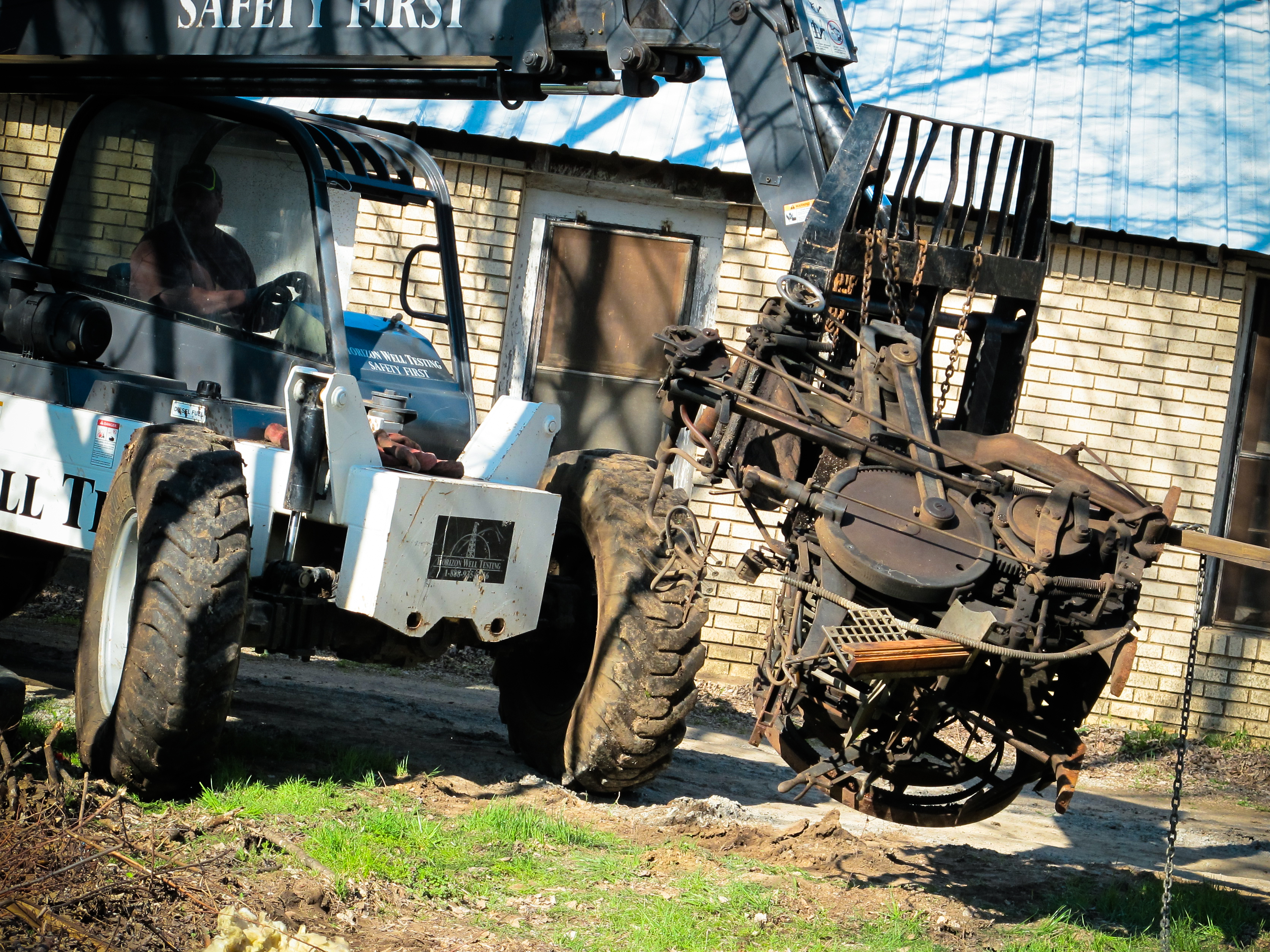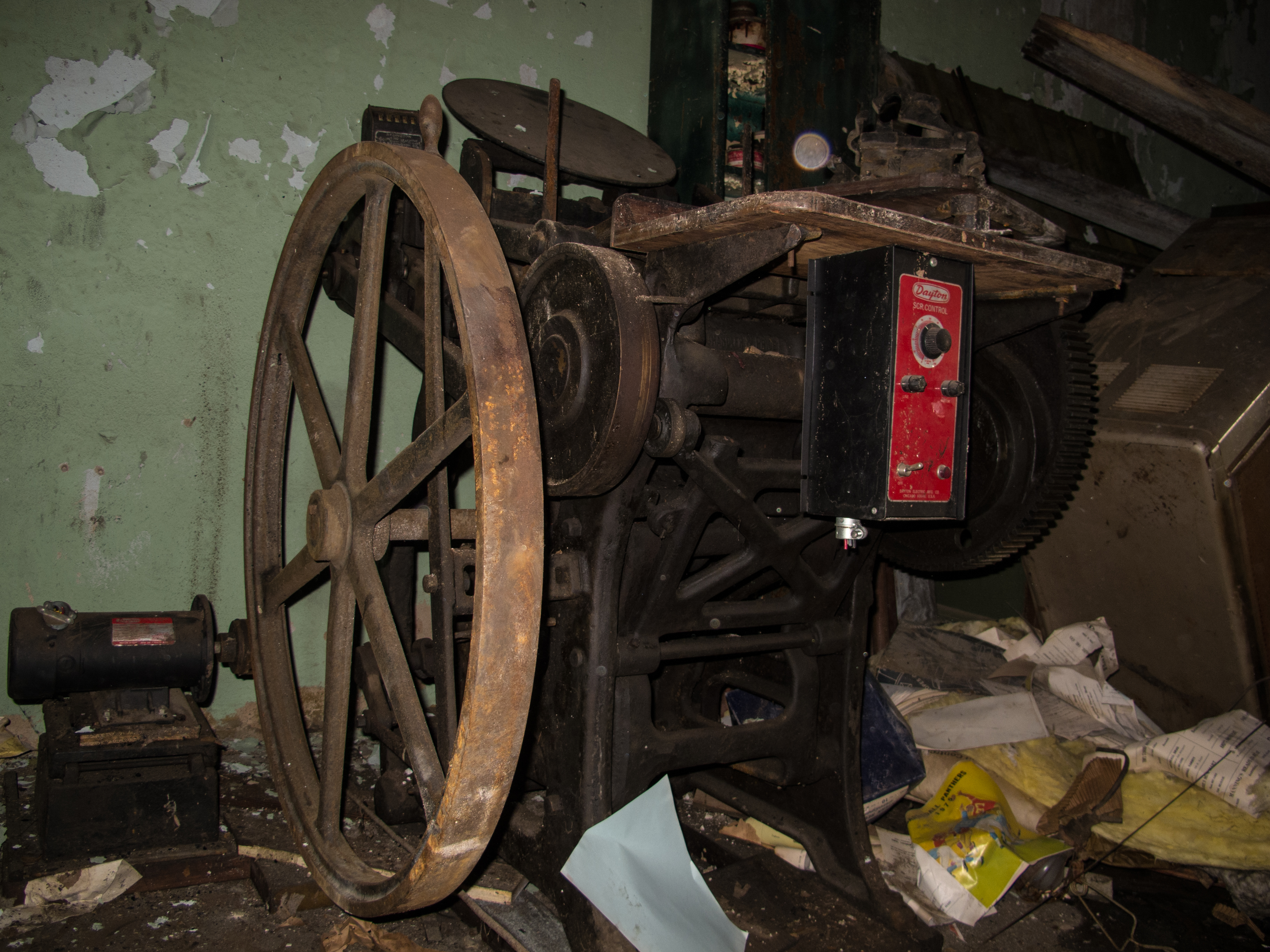 I didn’t fully appreciate the extent of the miraculous survival of the two printing presses until I saw the inside of the old print shop. The building had been neglected for decades, subjected to significant water damage before the fire happened. The bones of the structure were still intact, thanks to some solid stonework, but the insides were a cluttered mess. Chunks of insulation and old newspapers littered the floor as four of us (Thom, me, and two local fellas) figured out how to extract the 1,500 lb machines. In addition to the two presses I mentioned earlier, Thom and Christine were also going to see if they could restore a gigantic Kluge press that had once been used by the local paper. We cleared out a path to the back door so the fork truck could extend into the building to lift the presses out one at a time. As we worked, I was stunned at how the office appeared to just have been left as-is when it was shuttered thirty years ago. Old newspapers and small bits of lead type were strewn everywhere. Many parts of the shop were inaccessible due to piles of furniture and other unidentified machine parts. There was even a smelter in the back that was used for melting down lead type so it could be recast.
