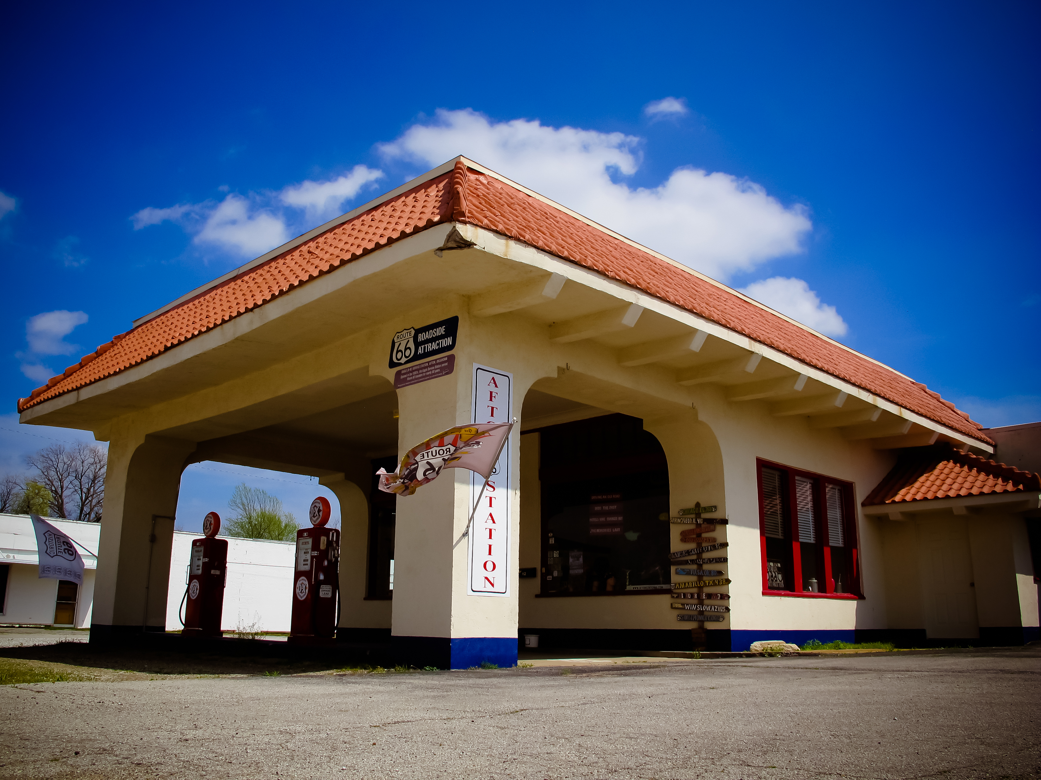 I walked into Afton Station and shook hands with Ron, who was there to meet up with a group touring the entire Route that had flown over from the Netherlands. Route 66 is very popular with people from other countries, and why wouldn’t it be? The road encapsulates the American experience in a way that few other things can. I also had the pleasure of meeting the proprietor of the Station, a lovely woman named Laurel. Not only did she run a little gift shop, but the station also held a Packard automobile museum! I met some of the other Station folks and toured the facility. There are a lot of great old cars there, including a classic Studebaker and a few other non-Packard classics. My favorite vehicle was a behemoth way in the back: an old Packard RV from 1917! It had a little burner stove, space for an ice box, and a fold-out bed. The steering wheel was wooden and the instrument cluster was extremely sparse. There were a few levers near the driver’s seat, too, but heck if I know what it was all used for. A SUPER COOL vehicle!