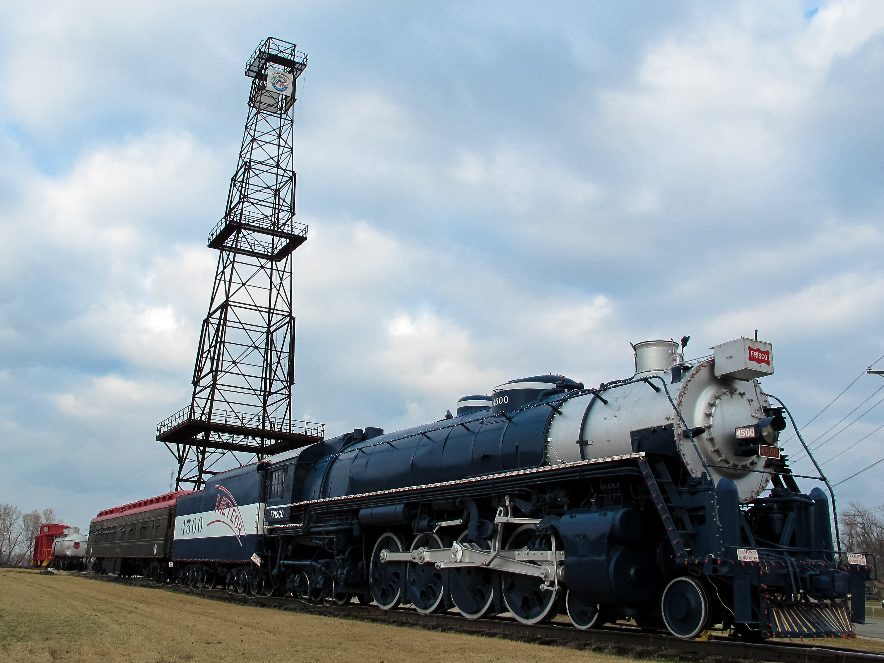 Our next stop, the Route 66 Village in Red Fork, greatly exceeded my expectations. The area is known for being where the first oil well was struck in Tulsa County, leading to Tulsa’s brief time as the Oil Capital of the World. The village has an oil derrick, a few old train cars from the Tulsa-Sapulpa Union Railroad, and a grand locomotive called ‘The Meteor’ from Frisco railway. A kind and informative gentleman was there in full train engineer garb, and he welcomed us to the roadside attraction. I’ve been out to the Route 66 Village dozens of times, but this was the first time I’d seen anyone officially with the village out there. We spent the better part of half an hour talking about the attraction as it was, as well as their expansion plans for the future. In addition to the aforementioned railroad artifacts, there are plans to build two replica service stations, a replica hangar (complete with bi-plane) and a depot. He was very excited to share this information, and we were excited to listen. I can’t wait for it all to be fully realized.