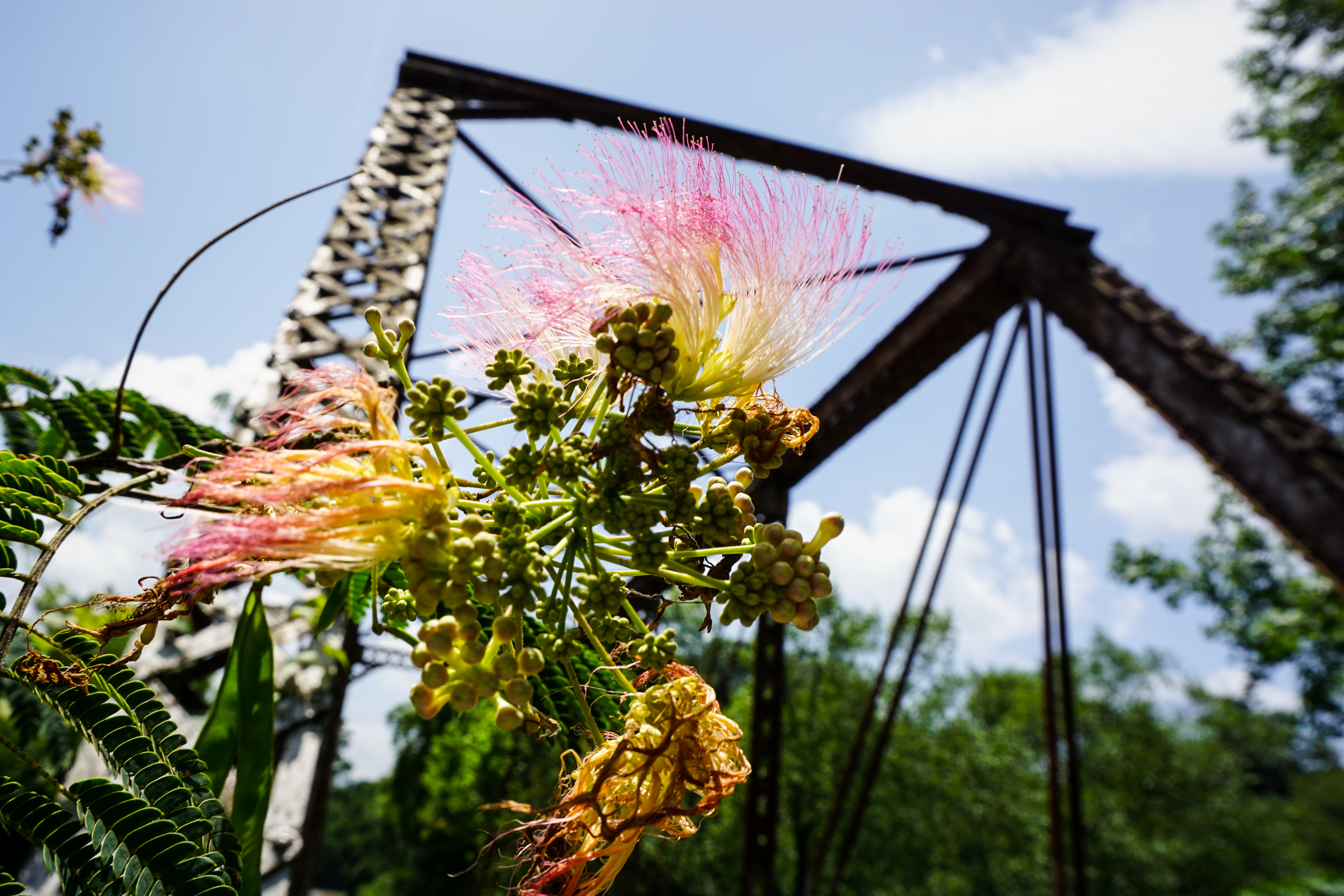 As I entered the Ouachita National Forest to the north of the memorial, my cell service began to suffer. My next destination was near the town of Haw Creek, which was situated near the Arkansas border in a very rural area. My map had stopped showing me individual roads (thanks to my attempt to re-route with one bar of service) and as I got closer I had to guess on which turns to take. Furthermore, Google Maps doesn’t support notes for marked locations, so I wasn’t entirely sure what I was looking for. I guessed it was a bridge, and I ended up being correct. It was also slightly irregular, as it’s very tall and extra narrow. Some online research suggests it may have started out as a railroad bridge somewhere else before being moved. It spans Big Creek, which was one of the clearest streams I’d seen in the state, and there were some beautiful flowers on the north side of the truss. I’m not sure what kind they are; they look like botanical fireworks!