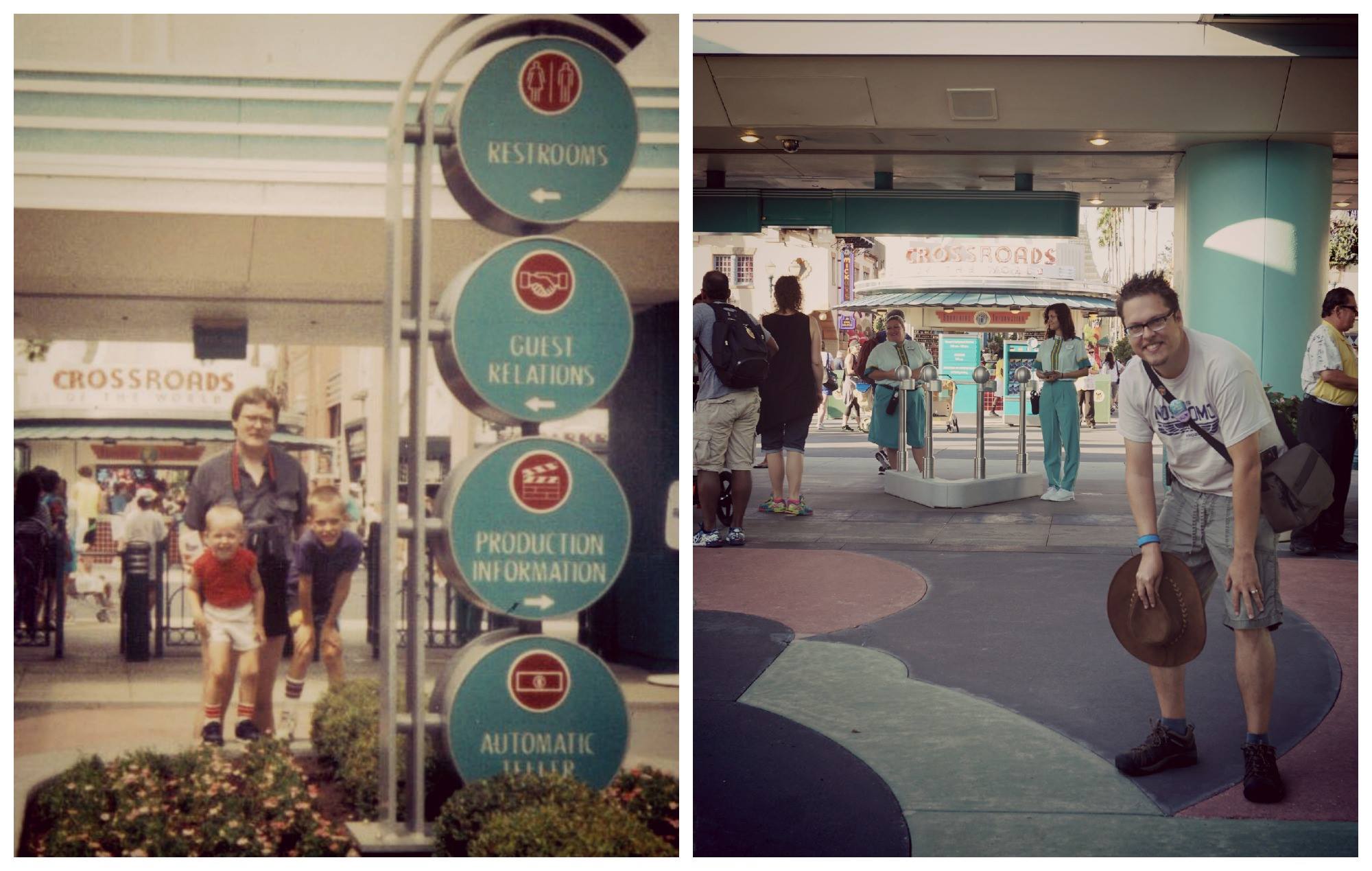 When we strolled up to the entrance, I looked for a particular flower bed. I had a picture of Dad, my brother, and me in front of the gates from back in the day and I wanted to try to recreate it. Since the area had now become a simple flat walkway, I wasn’t able to position myself perfectly…but I got close! I was delighted to see that the major signage still had that retro Hollywood feeling. As we entered the park proper, I realized that most of what was around me was exactly how it was all those years ago. I knew that the park was due for MAJOR work (over the next three years, they’re adding a Star Wars land and a Toy Story land, in addition to renovating the majority of the existing park) and it became obvious that it had been the least updated over the course of my absence. That didn’t bother me, though. It remained my favorite of the three parks, partially due to the overwhelming sense of nostalgia that greeted me at every turn. I was very pleased to see Gertie the dinosaur was still standing at Echo Lake!