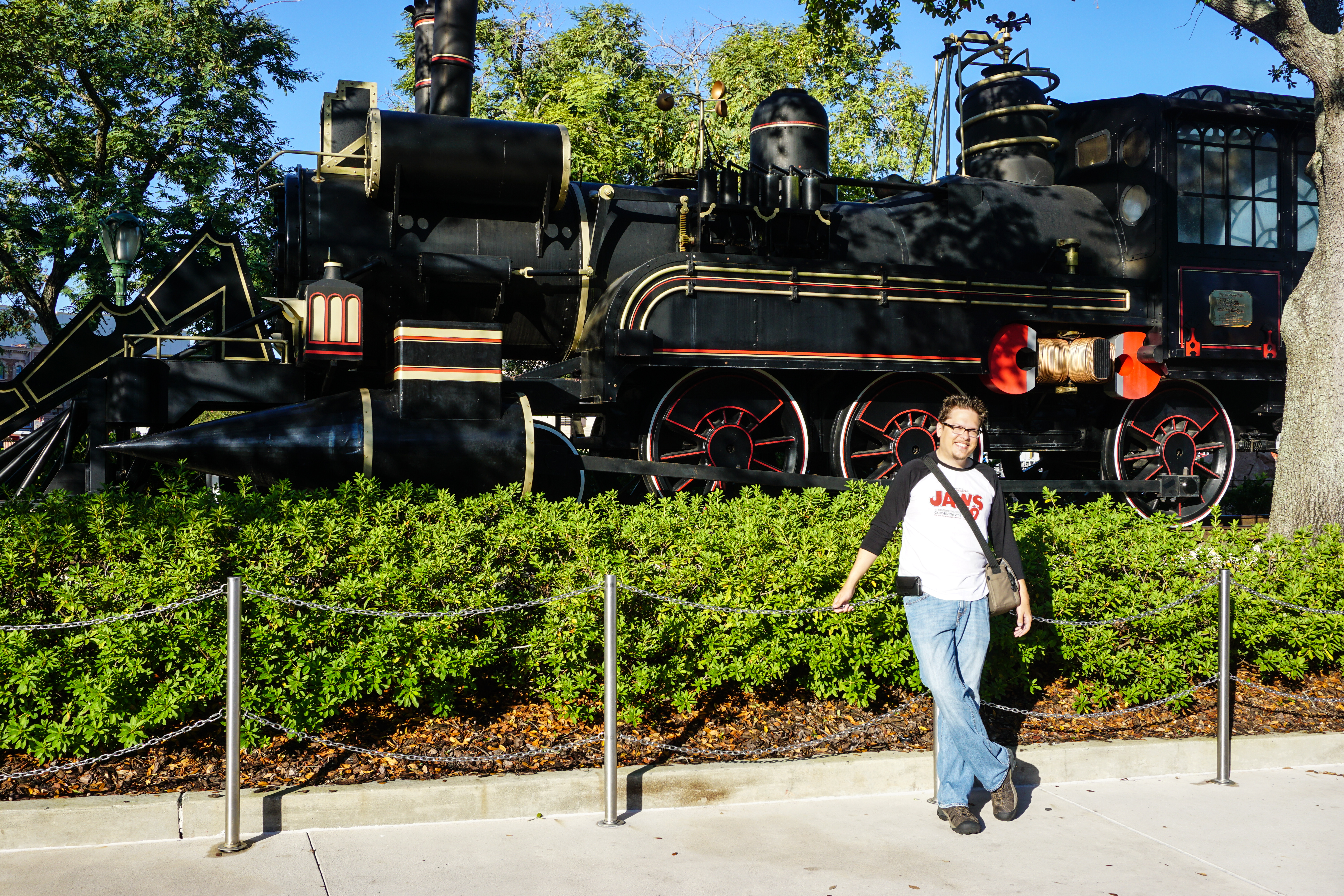 Since the sister park (Islands of Adventure) didn’t open until 9:00, we wandered around the rest of Universal. All of the surfaces were wet; not because of rain, but because everything had been drenched just before park opened. Sam and I had to watch our step as we walked. Heck, even the tray we got our breakfast on was wet! My beloved Back to the Future ride had been replaced with a Simpsons experience, which neither of us were passionate about experiencing. I did take some pictures with the DeLorean and Time Train, which were happily still nearby, though relegated to a little park next to the lagoon. I saw a Back to the Future item display in a storefront near the park entrance and excitedly went inside. I looked everywhere and couldn’t find anything, so I asked a lady. “Where is your Back to the Future merchandise?” “We don’t have any of that here,” she said. No explanation, nothing. I walked outside and stood at the window display, confused. Then, I saw a small plaque in the corner of the window talking about the history of the old attraction. It also mentioned some merch was available at another shop further in the park. Why didn’t the lady just tell me that? And why display stuff you can’t buy at that store? Oh well. I did get a fist bump outside from Woody Woodpecker due to my Jaws 19 shirt.