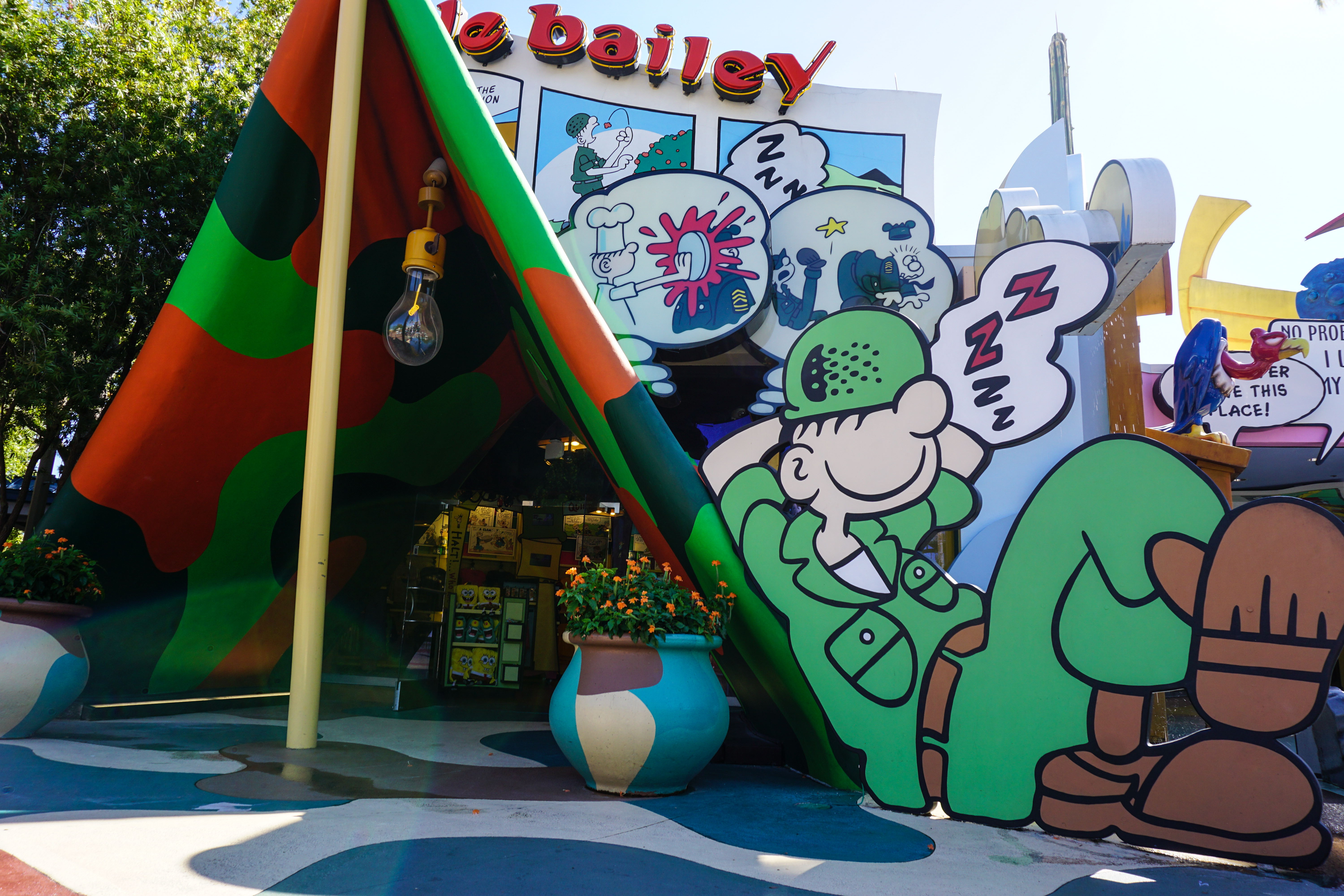 Hogsmeade, likewise, is well-designed and a delight to experience. The rooftops are all snowy, the castle appropriately looms in the distance, and Butterbeer flows freely at the Three Broomsticks. Sadly, it appeared that all of the rides in that area were coasters, which Sam and I weren’t fans of. After we had toured the shops, we set out to see what else Islands of Adventure had to offer. Short answer: not a lot for us. Each “land” had a jarring transition. I could easily see Hogwarts from Jurassic Park. Although we love the JP franchise, the only major ride we saw was a big water ride where all riders exiting looked like they had been completely submerged. The ride we WERE interested in, the treetop flying ride, required a child to accompany us. No-go there either. The next zone we wandered into was Toon Lagoon, an area featuring rides inspired by a ton of Sunday morning cartoon strips like Popeye, Beetle Bailey, Hagar the Horrible, etc. Also a ton more water rides. I noticed that one of the shops was faced with Spongebob and Minon gear, even though this part of the park wasn’t related to them at all. Guess they had to get kids in the door SOMEHOW. Once inside, it was all Betty Boop, Marmaduke, and Blondie. The whole segment felt out of place.