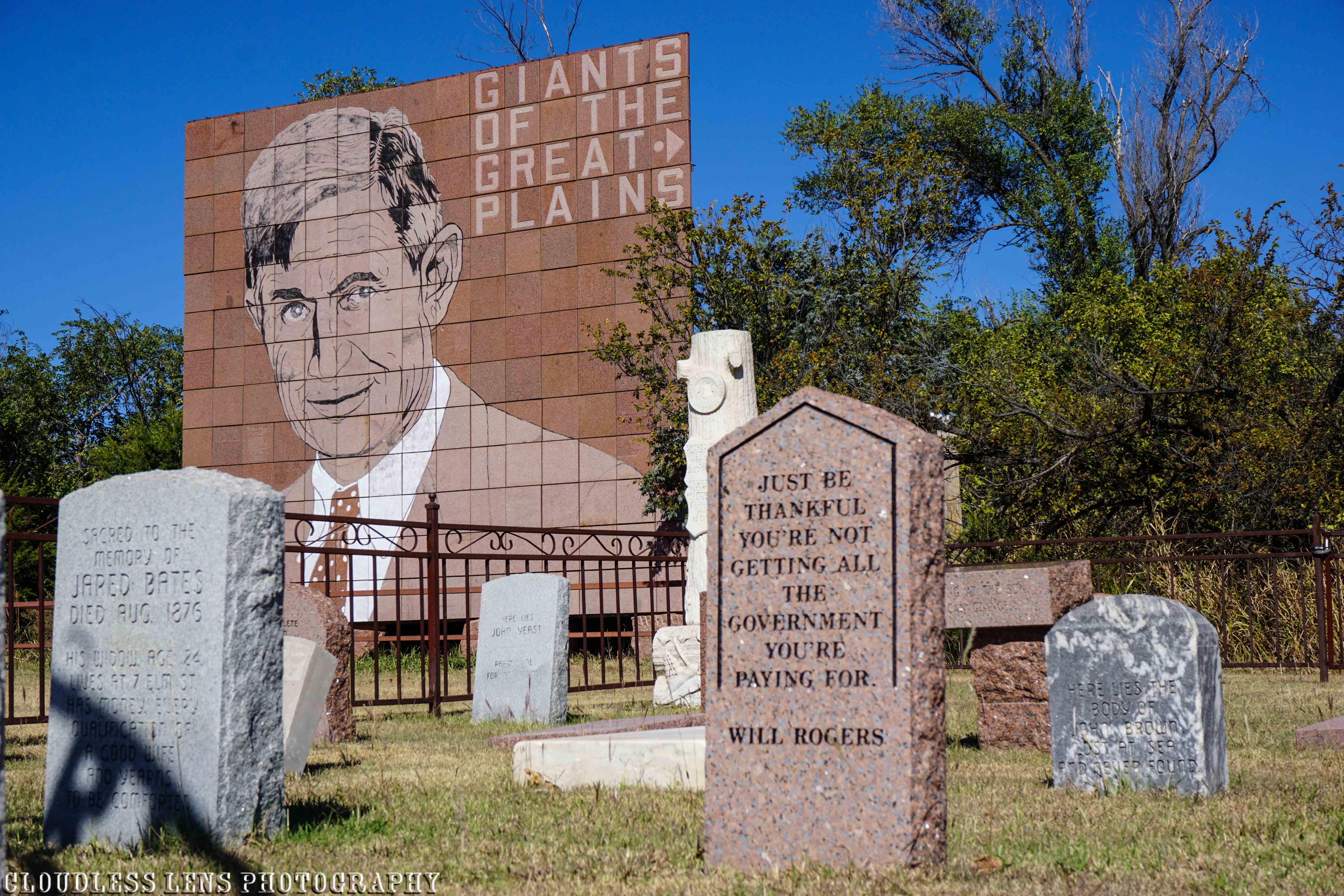 The small graveyard was originally established in Wichita Falls, Texas as a humorous attraction. Since all of the custom headstones were made in Granite, it was donated in honor of Dr. Dan and Eleanor Roberts, the originators of the stones. They are all engraved with witty sayings or Haunted-Mansion-Style epitaphs. It’s really something, and fits right in under the stony gaze of Oklahoma’s well-known humorist.