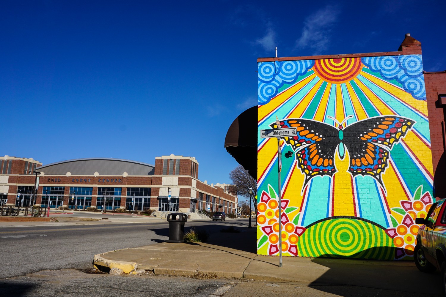 Enid is another town I’ve been to before, but last time through wasn’t much more than a pass-through. This time I didn’t stay long, either, but I did stop and wander a little. I bought some coffee from a local shop (Five80 Coffee), admired the Art Deco Broadway Tower (built in 1931 and seems to have had some work done recently) and drove around the Garfield County Courthouse. Town Square was a bit more spread out than Perry was, and the wind was still so biting that I limited my walking time…but there was one place I deliberately sought out: a mural by Rick Sinnett.