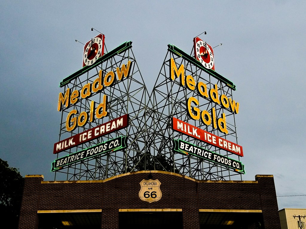 My favorite neon sign on the entire route, the Meadow Gold sign towers above the street on a custom building, built when the original home of the sign was demolished. Underneath the awning are several informational podiums. 1306 E 11th St