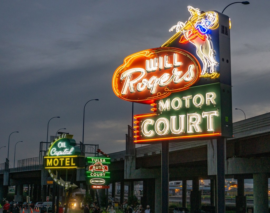 Three replica neon signs grace the southwestern side of the Cyrus Avery Memorial Bridge. This pocket park represents three eras of the road in Tulsa (Admiral Blvd, 11th Street, Skelly Bypass) as the road evolved. There are also a few small historic markers here to tell the story of these old motels. 1450 Southwest Blvd