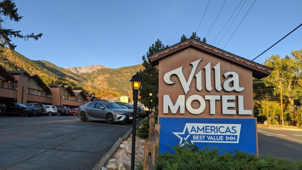 Our destination that first day was nearby Manitou Springs; my cousin Amanda had suggested it after they visited earlier in the year. It’s a quaint little town..and a Gold Mine for sign geeks! Many of the motels had their original signage in good working order; I wasted no time in capturing what I could. We stayed at the Villa Motel, which had a lovely old-school lodge feel to it. I greatly enjoyed looking at the historic photographs in the lobby and in our room.