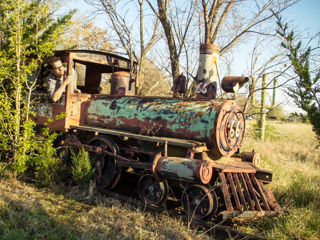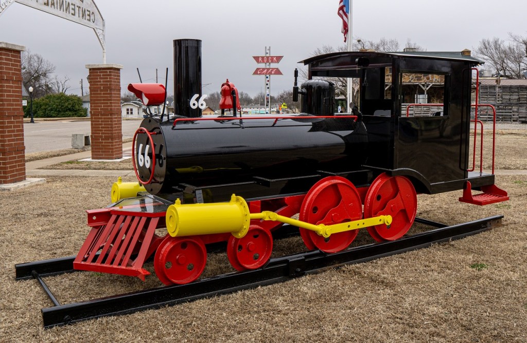 Close to the Lincoln/Creek county line east of Stroud, a rusty child-size locomotive peeked out of the bushes. It was impossible to see when traveling westbound and I’d been lucky to notice it as I was heading east. The patina on the metal helped it blend in with the environment. I giddily took photos of the train and a few surrounding metal sculptures (a cow skeleton, a cactus). When I got home, I was surprised to learn that its existence was a surprise to quite a few roadies.