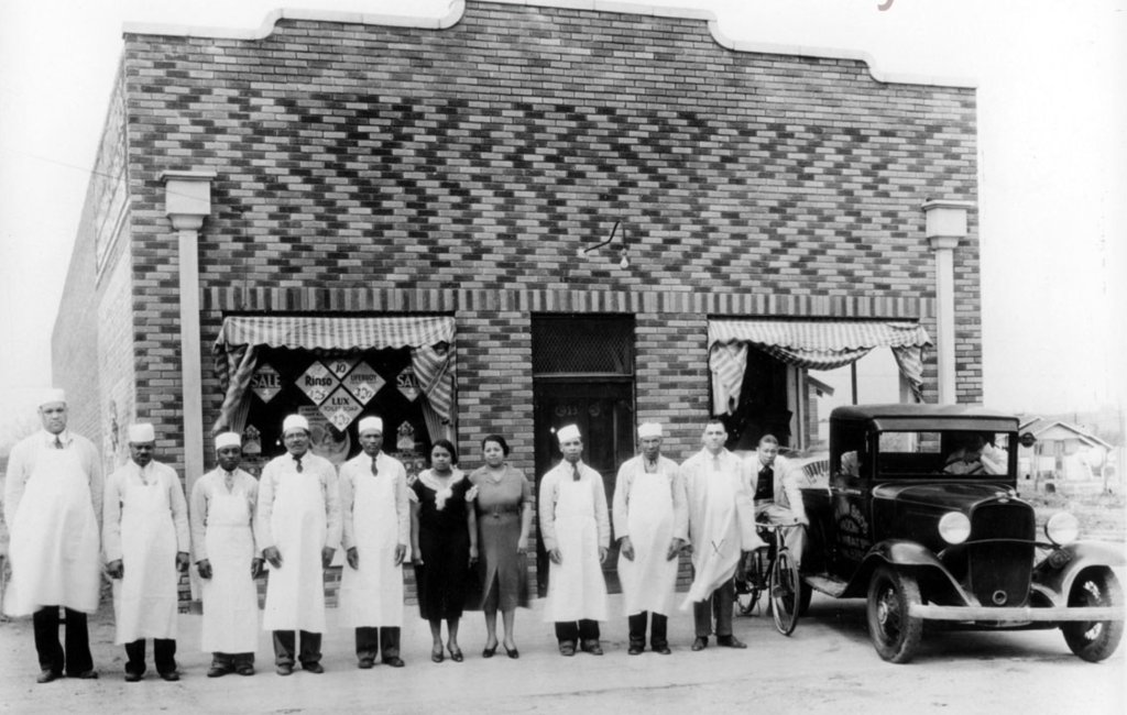 McKinley Monroe Mann along with his brothers Obie and J.D. opened their original market in 1919 at 1502 N Lansing Ave. This photo shows their market with staff. It would eventually grow to become the largest in Tulsa with five butchers on the payroll. Obie Mann is the tall gentleman on the far left.