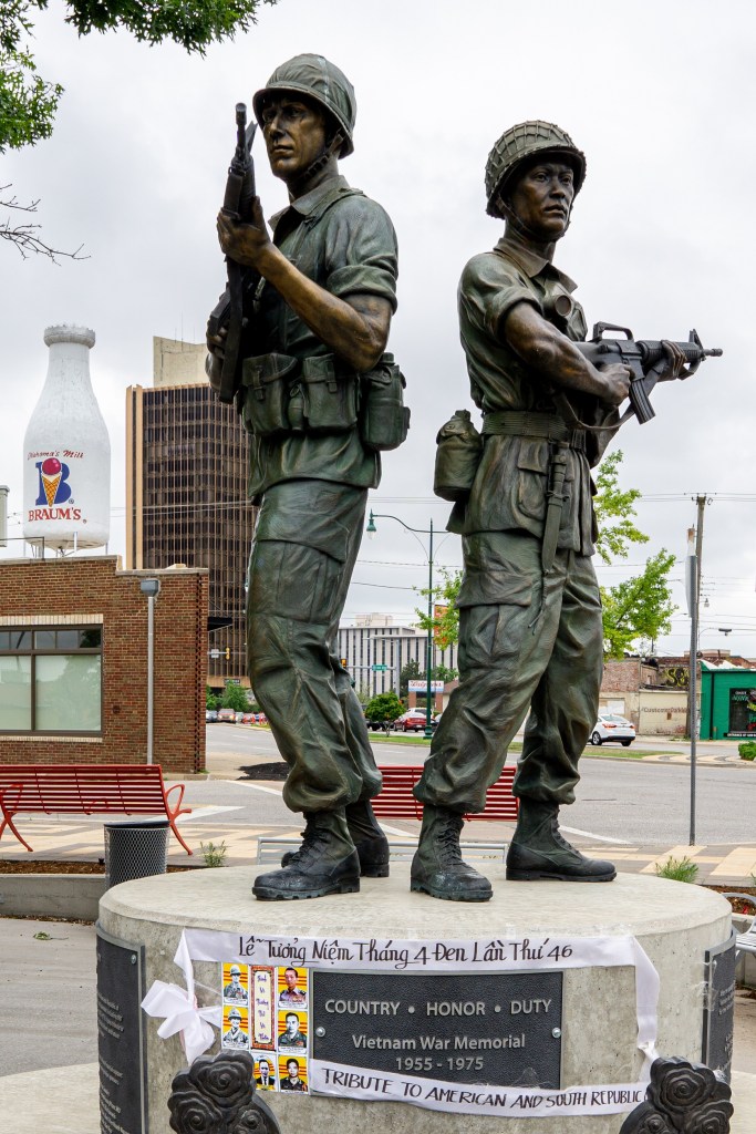 There are always a few landmarks I stop and see, such as the Milk Bottle Building near 23rd and Classen. Right next to it is a small park I’d not ever taken notice of before, featuring a statue of two soldiers: one American and one South Vietnamese. It’s called Brothers in Arms and is dedicated to veterans of the Vietnam War. The monument is in the heart of “Little Saigon”; a short walk around the block offers a wealth of cultural experience and, from what I’m told, some of the best Asian food in the region.