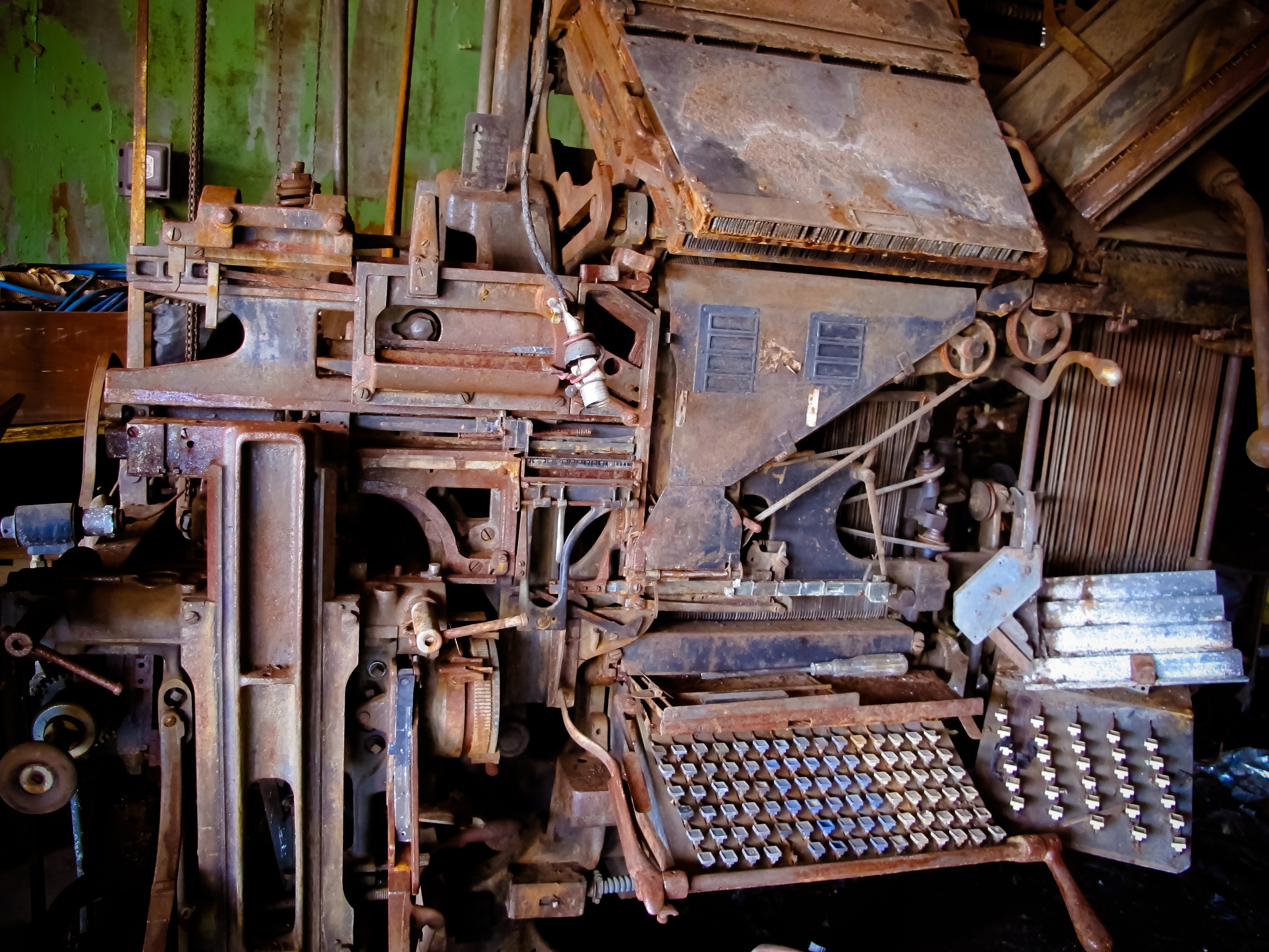 Which is not to say it wasn’t rather terrifying: The Kluge platen press, a monster that weighed over 1.5 tons, was not only top heavy but was heavy to one side. It literally crushed multiple 2-by-4s and pallets. At one point, it toppled into a support beam in the building, nearly taking out the toe of Thom Crowe when his foot was caught under the forks on the sky lift. It turned out to be the beginning of the end: That press ended up breaking, and wound up at the scrapyard.