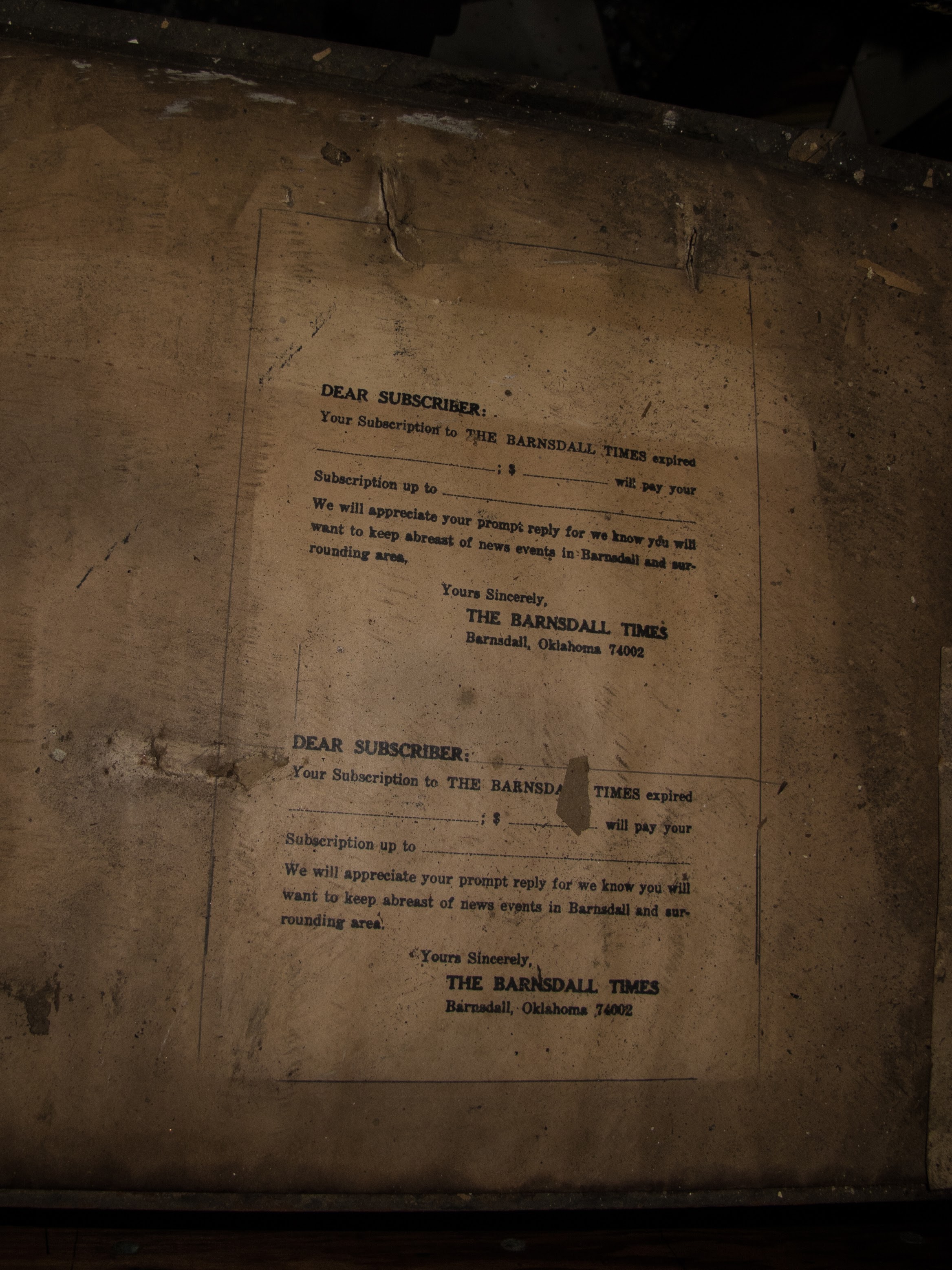 I had never known that it was a very busy and apparently lucrative print shop. I have found the aforementioned plates for Tulsa, Oklahoma City and Bartlesville police tickets, as well as tons of forms for oil gauges, banks, accountants, gift certificates and forms too numerous to mention. Matt Mace, the grandson of Art Moore, who published the paper and ran the print shop from 1930 until 1972, told me that his grandfather sold the business to Bob Evans for the princely sum of $75,000. Moore lived on investments from that money for the rest of his life, and died well off in 2009 at the age of 101.