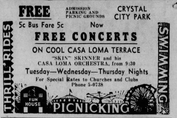 Business declined in the post-war years and Crystal City Amusement Park closed in 1948. Several of the old rides were purchased by Lakeview Amusement in Mohawk Park. The picnic area remained open and the Casa Loma Ballroom/Terrace continued to host concerts for several years afterwards.