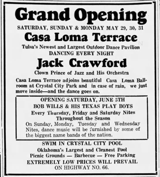 Bob Wills and the Texas Playboys played there often, as did orchestras and jazz performers from around the country. Casa Loma Terrace, a 13,000 sq. ft. outdoor dance pavilion, was added in 1937.