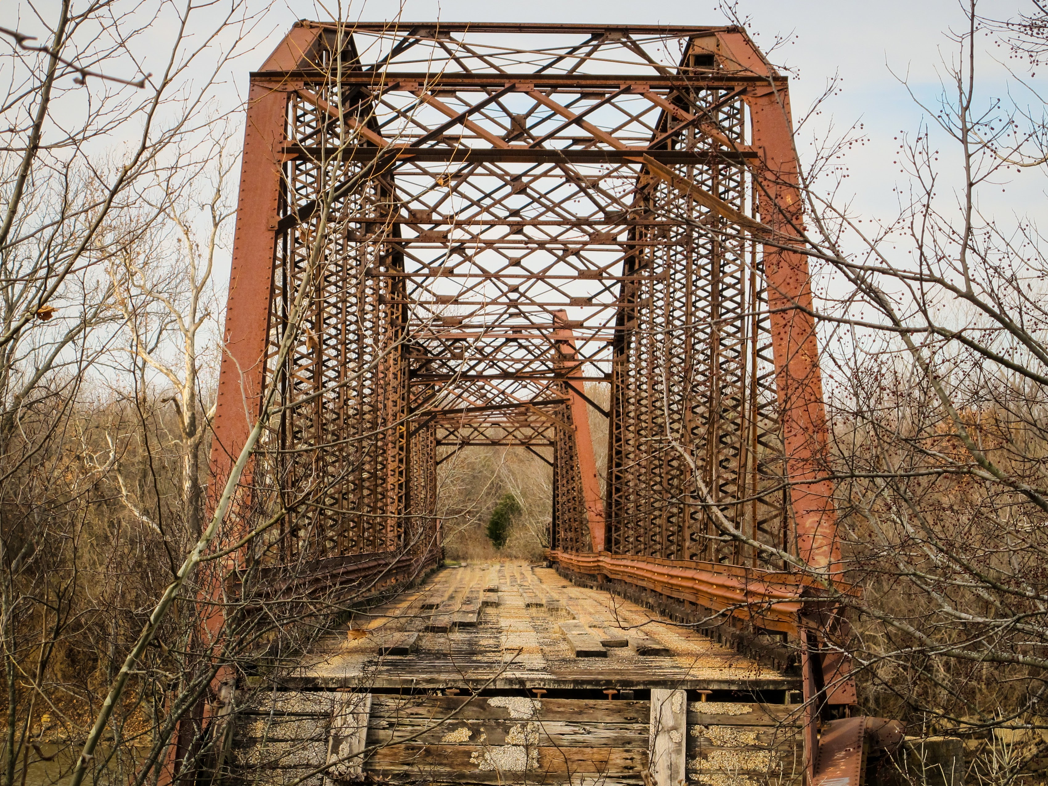 When I saw the bridge, it was clear that it was compromised in multiple ways. The eastern approach pony truss had fallen, meaning a walk across was out of the question. The wooden deck wasn’t wholly intact anymore, anyway, so that was probably for the best. The western span was noticeably askew; the concrete pier was crumbling and the huge steel truss was starting to slip. It was a miracle that it was still mostly standing, honestly. Still, I enjoyed walking around the bridge, taking photos and imagining a world when this was in heavy use. Who knew how much longer it would be around?