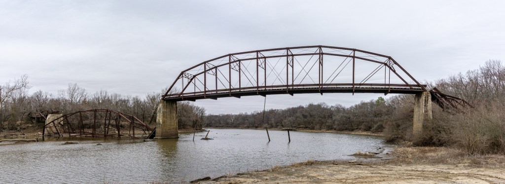 The new bridge in Okay started construction in late 1921. On February 23rd, 1922 workers were bolting the western through-truss to the concrete piers. Ten minutes after the last man got down to go to lunch, heavy winds blew the span into the river. This caused a delay (as you might imagine) but the free bridge opened later that year and it served the community for decades as a part of State Highway 16. The end came in the late 1960s, when the Verdigris River itself was re-channeled as a part of the McClellan-Kerr waterway project.