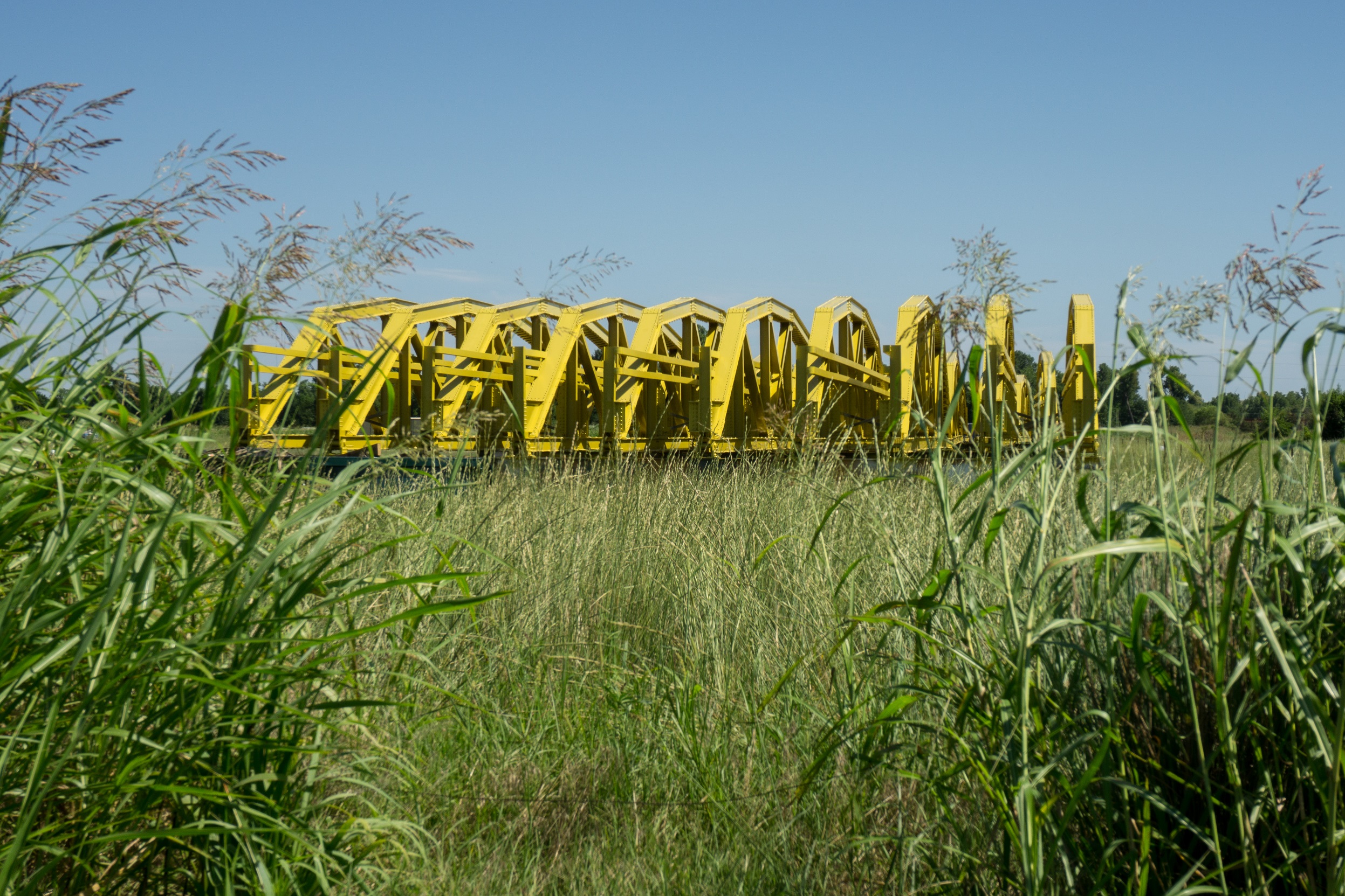The nearly 4,000-ft-long bridge, which opened on July 17th, 1934 as it happens, is undergoing a massive overhaul. The distinctive pony trusses are being rehabbed while the bridge deck is being replaced, slightly wider and better supported. The trusses will be re-attached to preserve the visual aesthetic the bridge is famous for. This was my first time visiting since the project began in October and I was happy to get a closer look at the pony truss sections, which were sitting in a nearby field. Some were rehabbed and freshly painted while others were still waiting for their turn. The bridge project is evidently ahead of schedule, with a great deal of the new decking already in place. It will be finished well before the Route 66 Centennial I’m happy to report.