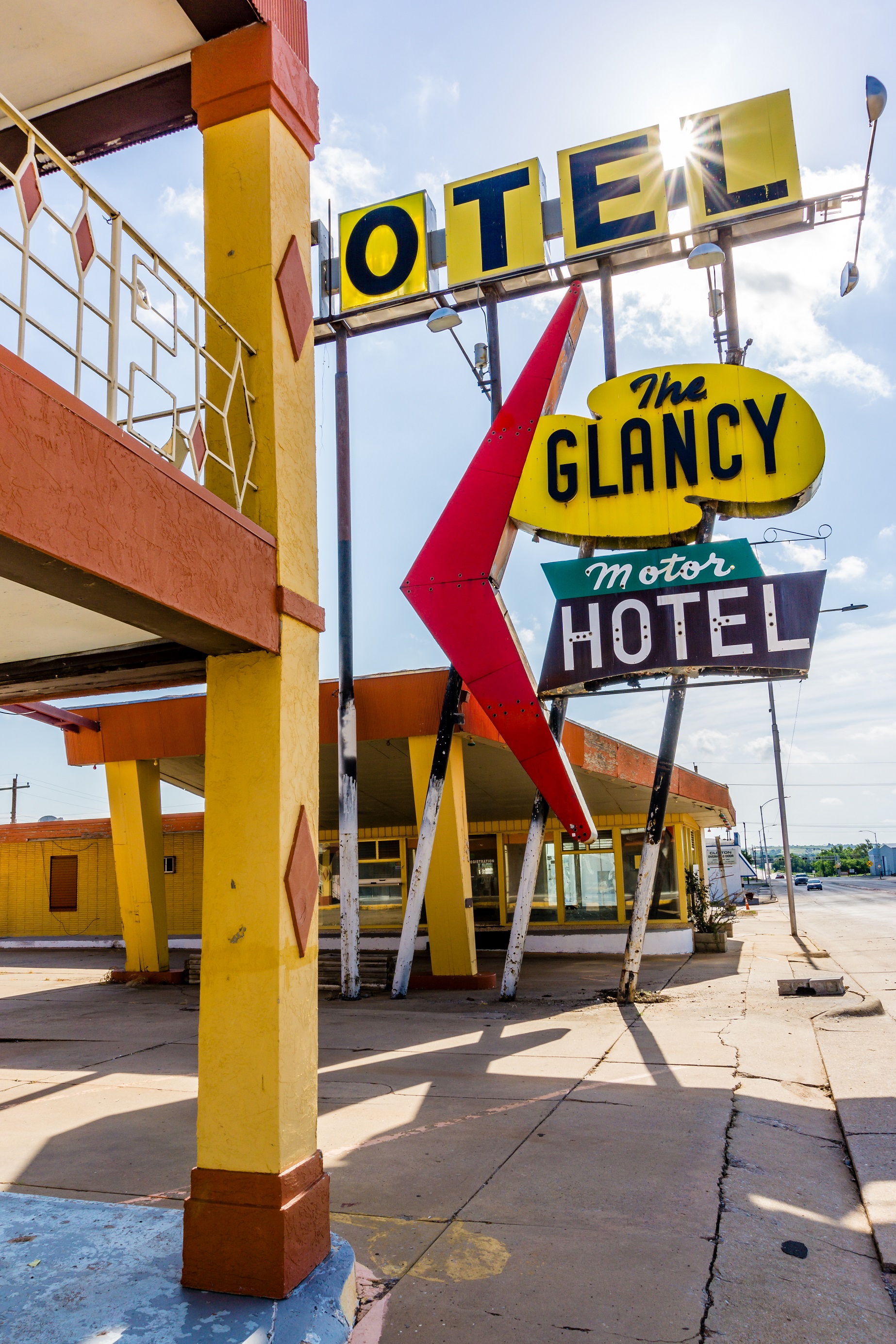 Clinton has held on to two vintage Route 66 motels over the years: the Glancy Motor Court and the Trade Winds Inn. Both were sadly run into the ground by dispassionate owners and fell into disrepair, catering to those that literally had nowhere else to go and often brought their problems with them. The Trade Winds, known for the room that Elvis Presley stayed in and its longtime owner, Walter “Doc” Mason, had just recently been demolished. It was next to a school and the conditions could no longer be tolerated. Only the modern, plastic sign stood and I’m sure it’s not long for this world.