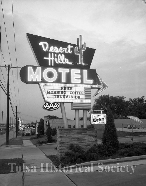 In 1957, the Desert Hills Motel was built just down the road also by Mitchell and Bennett. That stretch of Highway 66 was full of places to stay; within walking distance you could also stop at the Will Rogers Motor Court, the Tulsa Mo-Tel, Whitt’s Motel, Cook’s Court, Sheridan Hills, and more. Sometimes Leo would take a drive down to the other motels and count cars in the lot to compare business. The big change came in 1959, when the Skelly Bypass (later Interstate 44) opened up. 11th Street became “Business 66” and the clientele started to change. Soon after, the Trennepohls were put in charge of the Desert Hills.