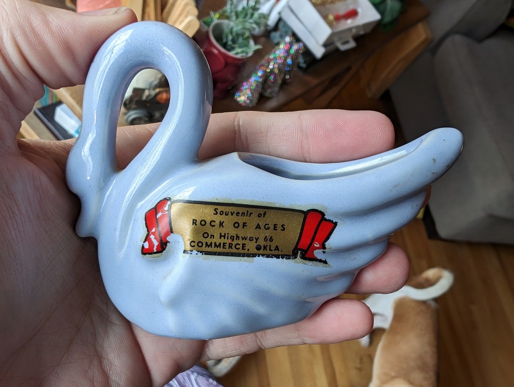 To be fair, I wasn’t planning to buy this little souvenir. It popped up on my eBay notifications and, although it excited me, I just left it. However, when the auction was a few hours from ending and there were no other bids, I decided to put in the minimum bid of $12 and see what happened. Well, now I am the proud owner of a Rock of Ages ceramic swan, another relic for my shelf.