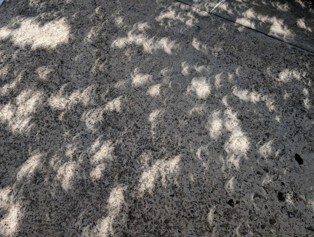 As the moon slowly moved in front of the sun, the skies darkened…but it was a weird kind of dark. It looked like those old Hollywood films where they shot “day for night” meaning some kind of filter was used to try and make sunlight look like moonlight. The birds and crickets started chirping differently and the streetlights came on. We looked at the sun through our eclipse glasses and the bright orange glow of the daystar became a sliver. The music on the loudspeakers was paused. Then, in the blink of an eye, the sun was totally obscured.