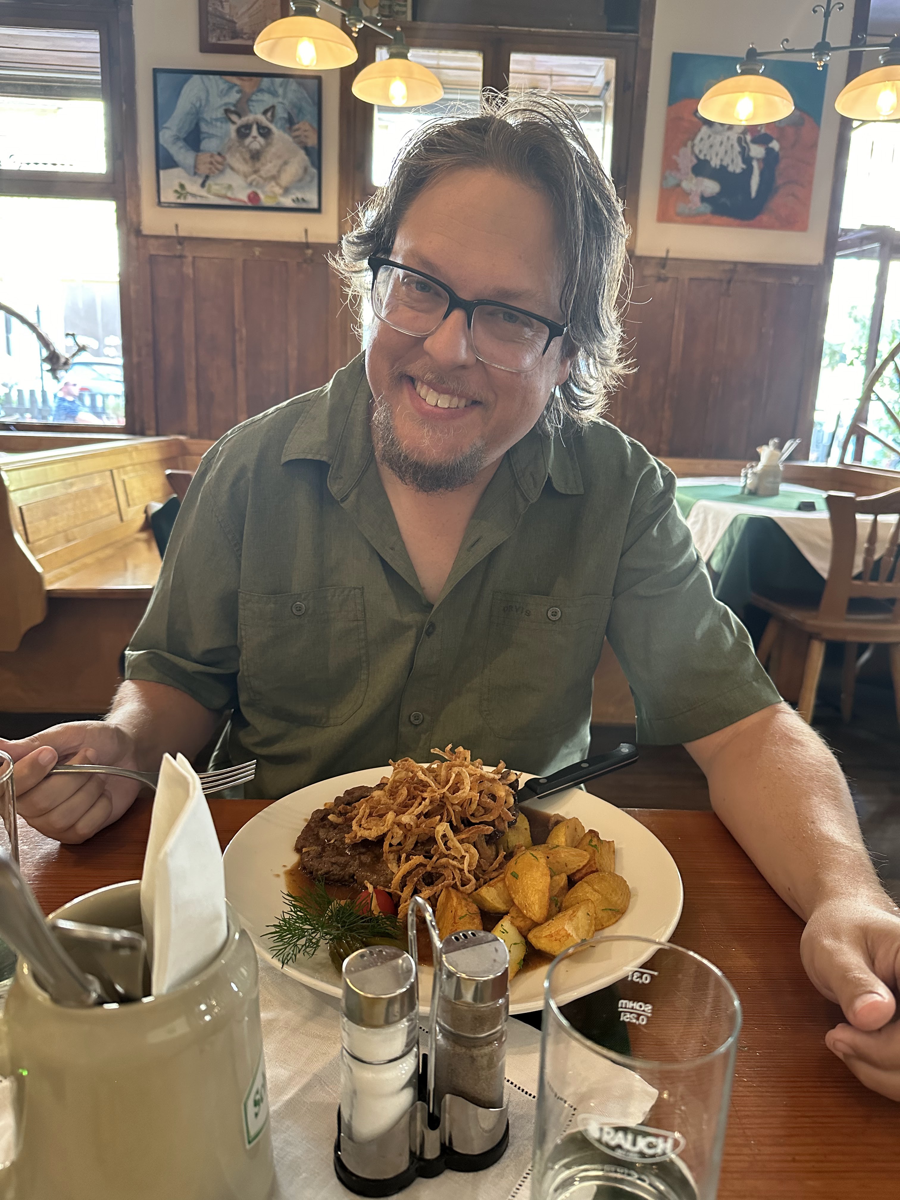 After one more night at Marián’s homestead and a stop in Bratislava to say farewell to Irina, we checked in to our hotel in Vienna for our Saturday flight home. We were pretty exhausted and didn’t explore the city much at all, I’m afraid. We did have an excellent meal, though, which like many meals I had over my time overseas consisted of meat, potatoes, and gravy of some kind. Right up my alley! Samantha had an impressive strudel, too.