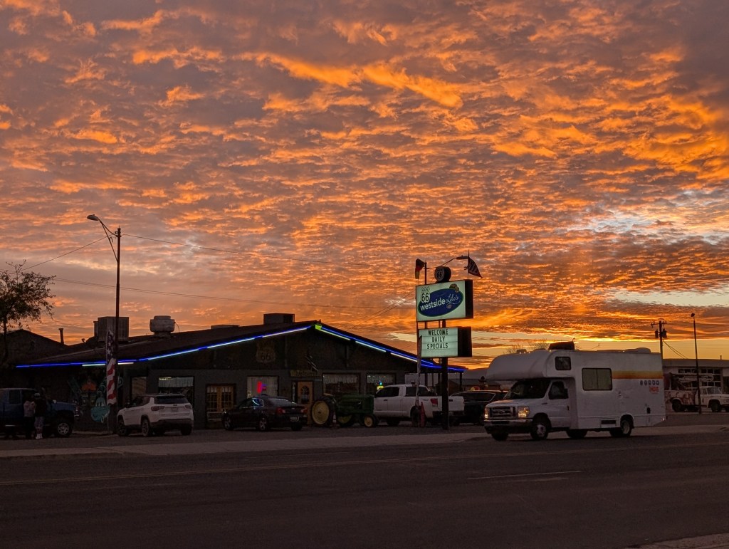 We parted ways as the sun began to set and my stomach began to grumble. I joined my friends Debbie & Bruce Mejia down at the Roadkill Cafe (which they own) along with surprise roadie guests Melissa & Ray Shereda from Springfield, IL. I had not seen them since the Hi-Way Cafe neon relighting in March of 2023! We were having a good time catching up – when another pair of familiar faces walked through the door. The President of Green Country Classic Mustangs (the car club I belong to back home) Nick Pollard and his wife Cassie were heading back to Tulsa from California and just so happened to be staying in Seligman the same night.