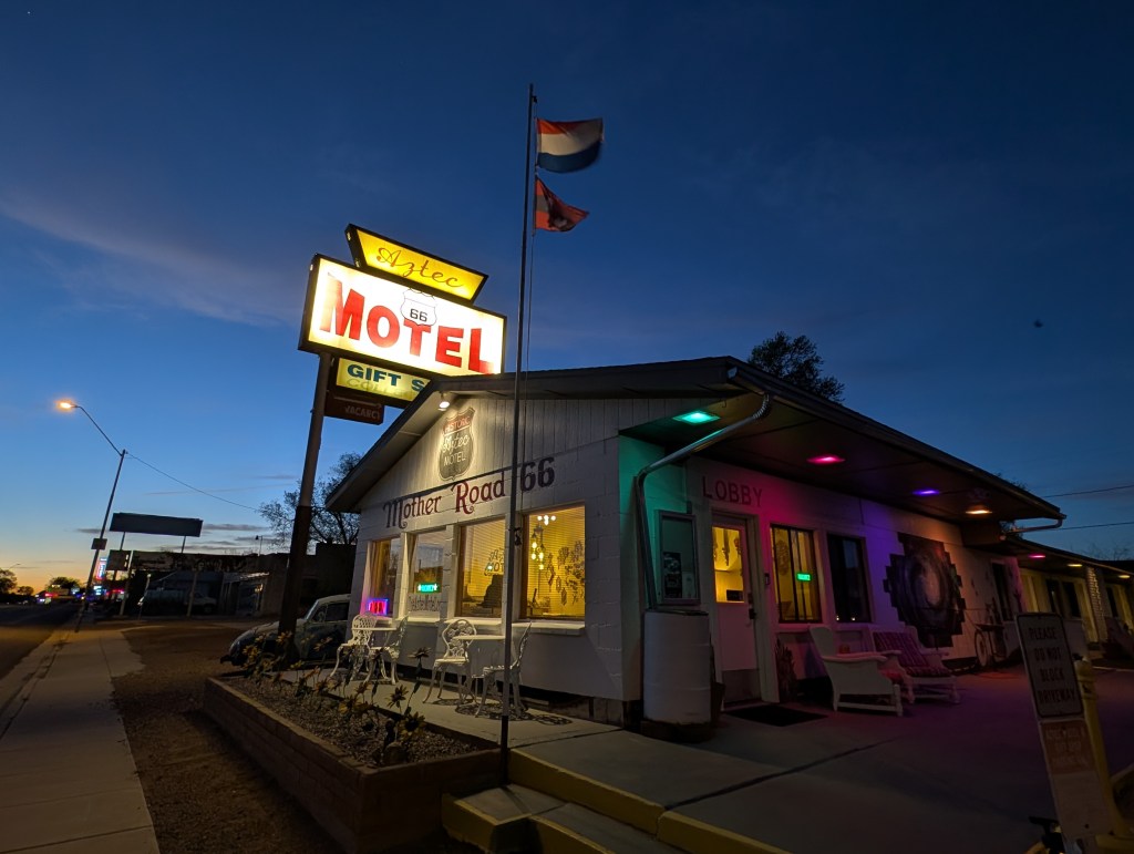 I sat down again and spent time in my thoughts. All of the bits and pieces of the Aztec – the friendly owner from another country, the comfortable spaces, the attention to detail, the instant feeling of home – it all reminded me so much of another place I’d loved, the Globetrotter in Holbrook. I’d stayed there a few times before they closed and the owners returned to Europe, the last time with Mom in 2019 on our way to the Grand Canyon. The sadness that had come with the closure of that meaningful spot was now intermingled with the comfort of this new one, a spiritual successor of hospitality.