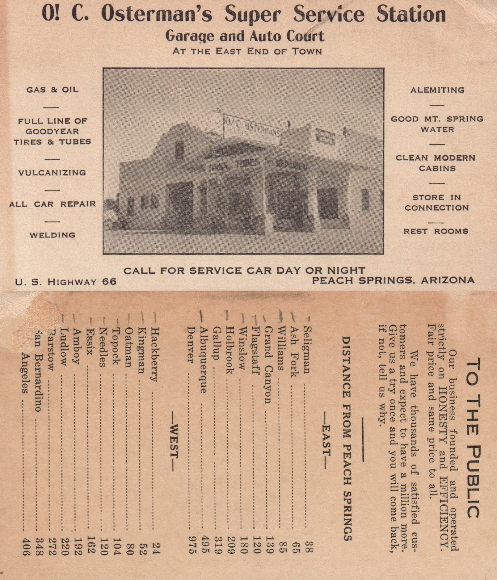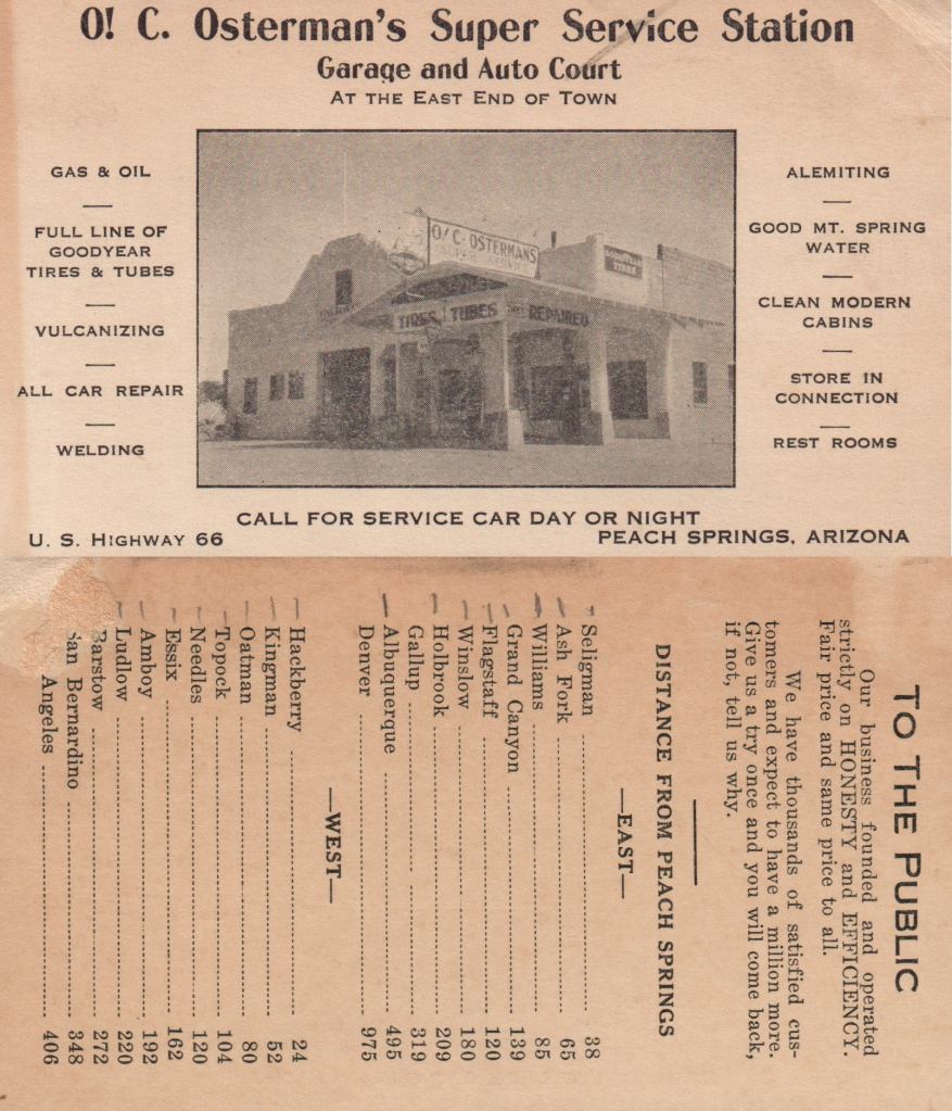 The town of Peach Springs sprouted along the railroad line within the heart of the Hualapai Nation in the late 1880s. John Osterman and his family had moved to the United States from Sweden around the time of World War I and eventually made it to Arizona. John opened his first service station and garage in Peach Springs in the mid-1920s; in 1929, three years after those first US 66 Highway shields went up, he built a new Shell gas station and garage right on the route.