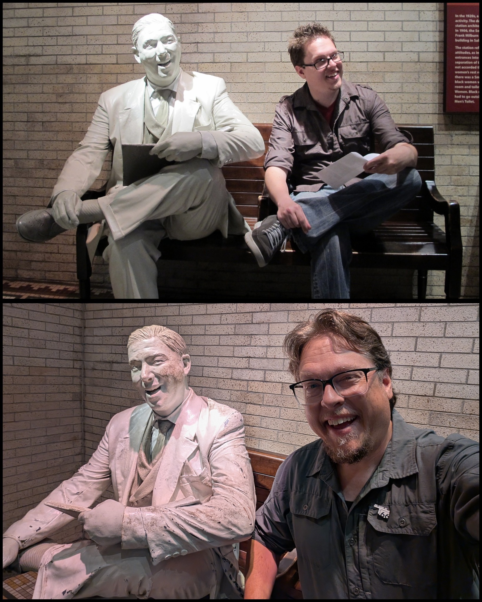 My time was limited, so I entered the museum and rushed through the exhibit to find the Route 66 section. I rounded the corner and saw something unexpected: a man on a bench. Not a real man, a statue of a man. He was part of the preceding section that talked about train stations. Mom had taken a picture of me on that bench where I posed with a goofy expression to match the statue. I decided I’d do it again as a selfie and sat down prepared to smile – but instead I was hit with a powerful jolt of grief. It was like a lightning bolt.