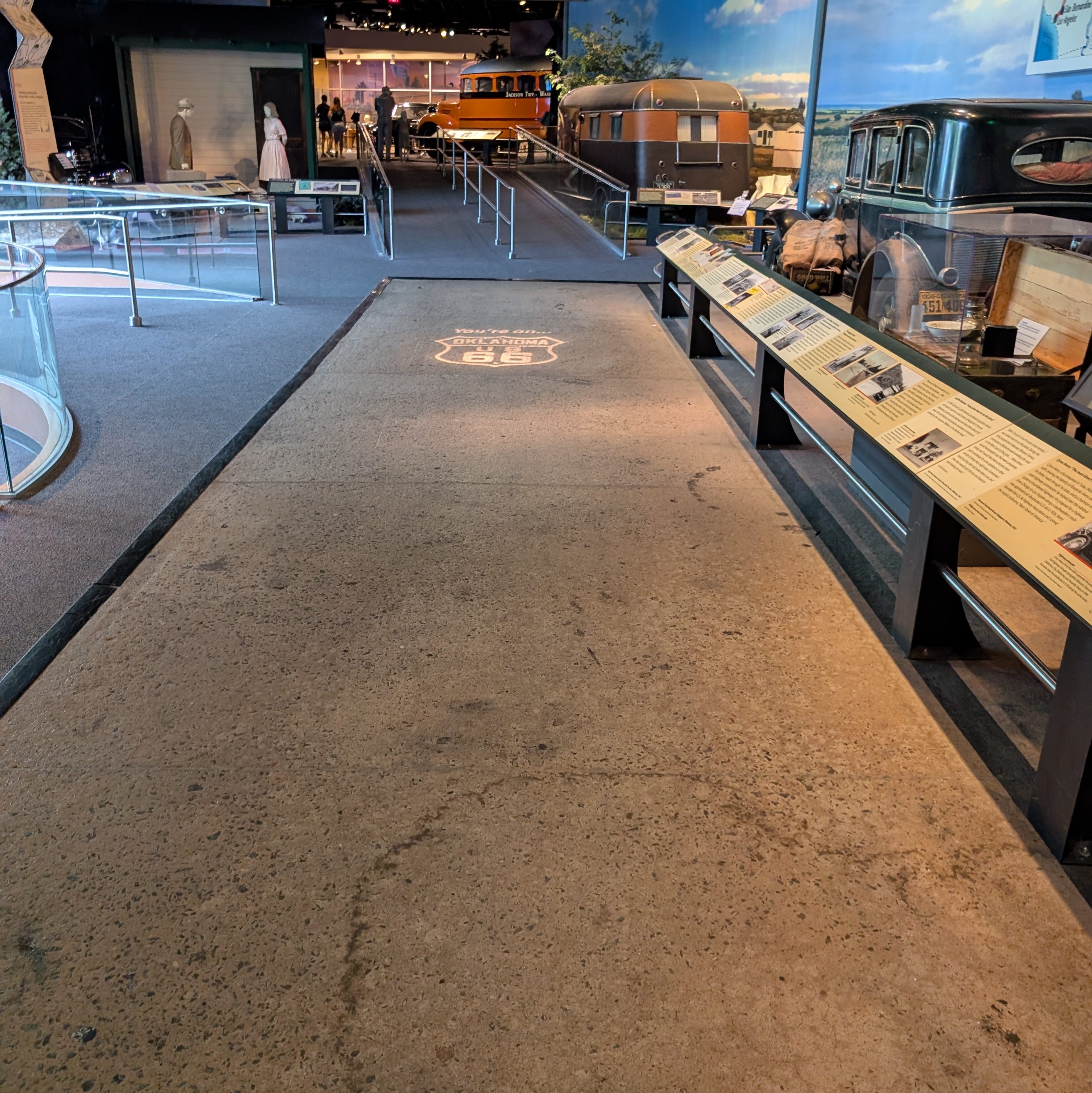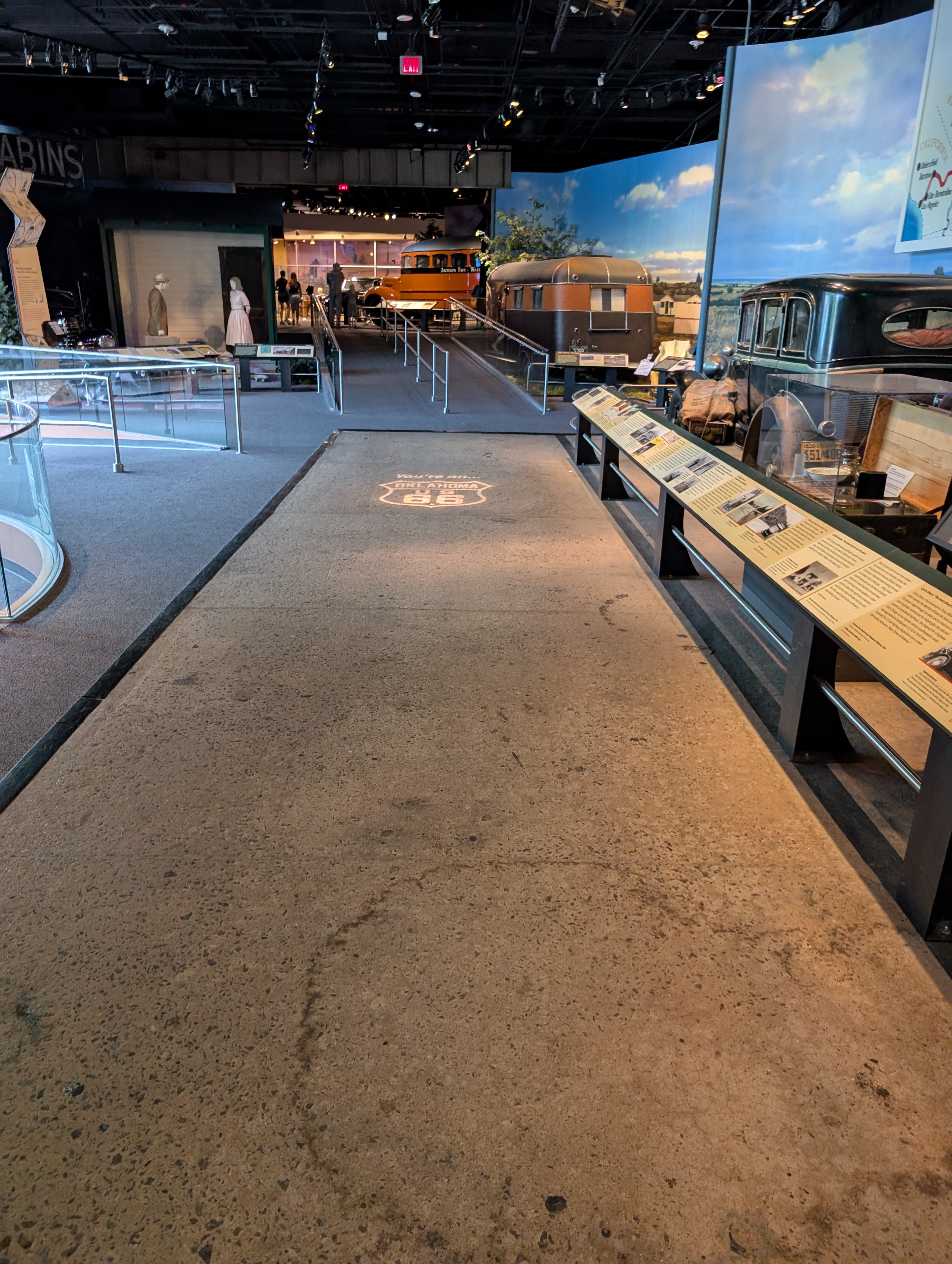 When I arrived at my hotel, I had very little time before our first scheduled gathering – less than an hour. Still, I booked it over to the Museum of American History to see something I’d seen before, but not REALLY SEEN, you know? It was the Route 66 section of their America On The Move exhibit. It’s hard to believe, but in the spring of 2013 I hadn’t given Route 66 much thought at all. In fact, when I wrote about our trip back then, I didn’t even mention seeing it, though I have a photograph that confirms I did, indeed, see it. Now that I knew its history (including that the concrete floor is literally original Highway 66 pavement from near Bridgeport, Oklahoma) it would mean a lot more to me.